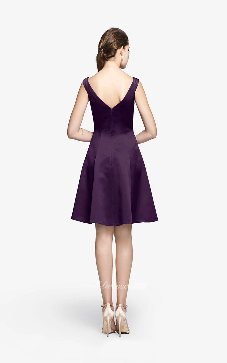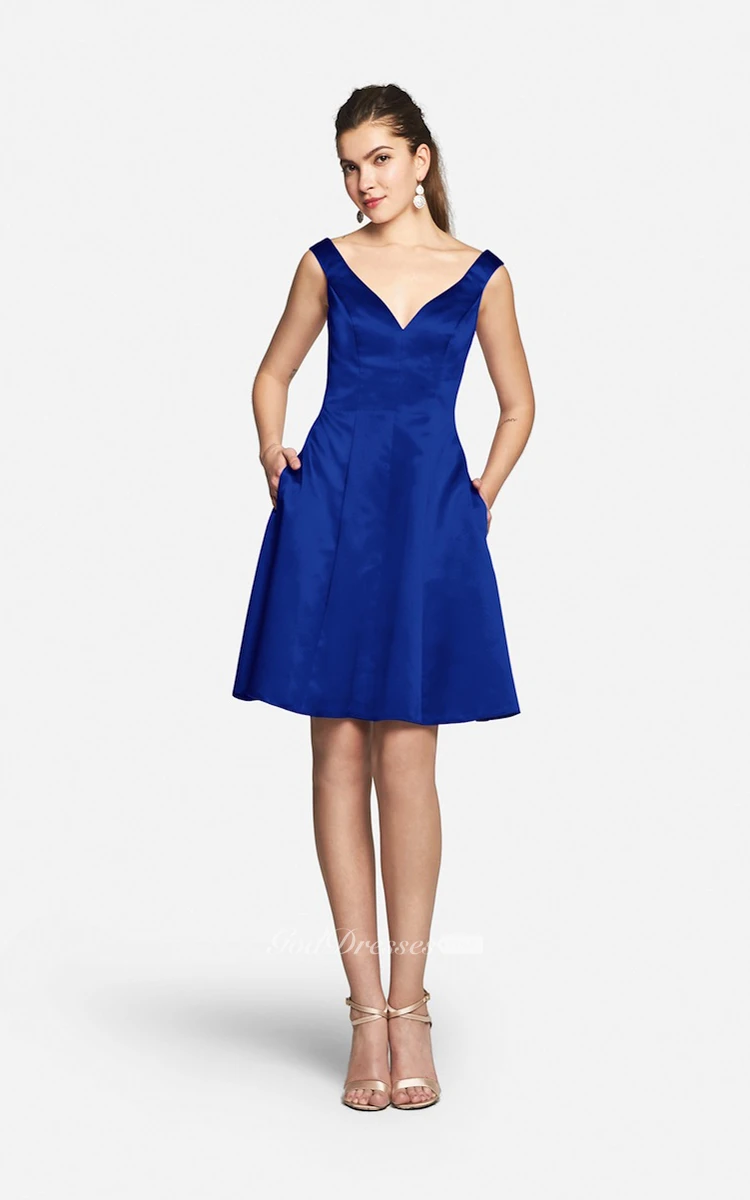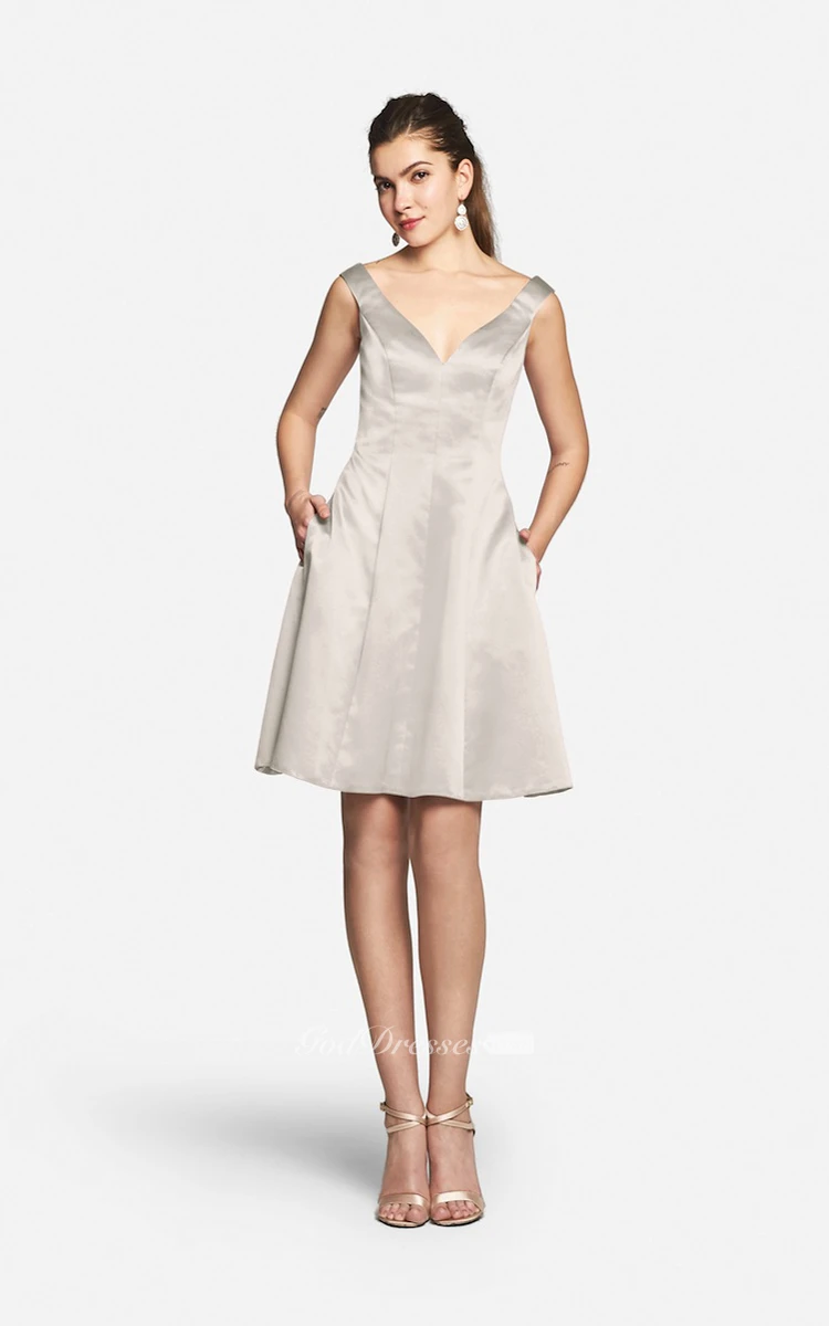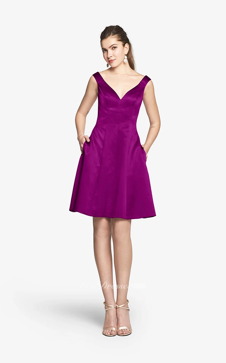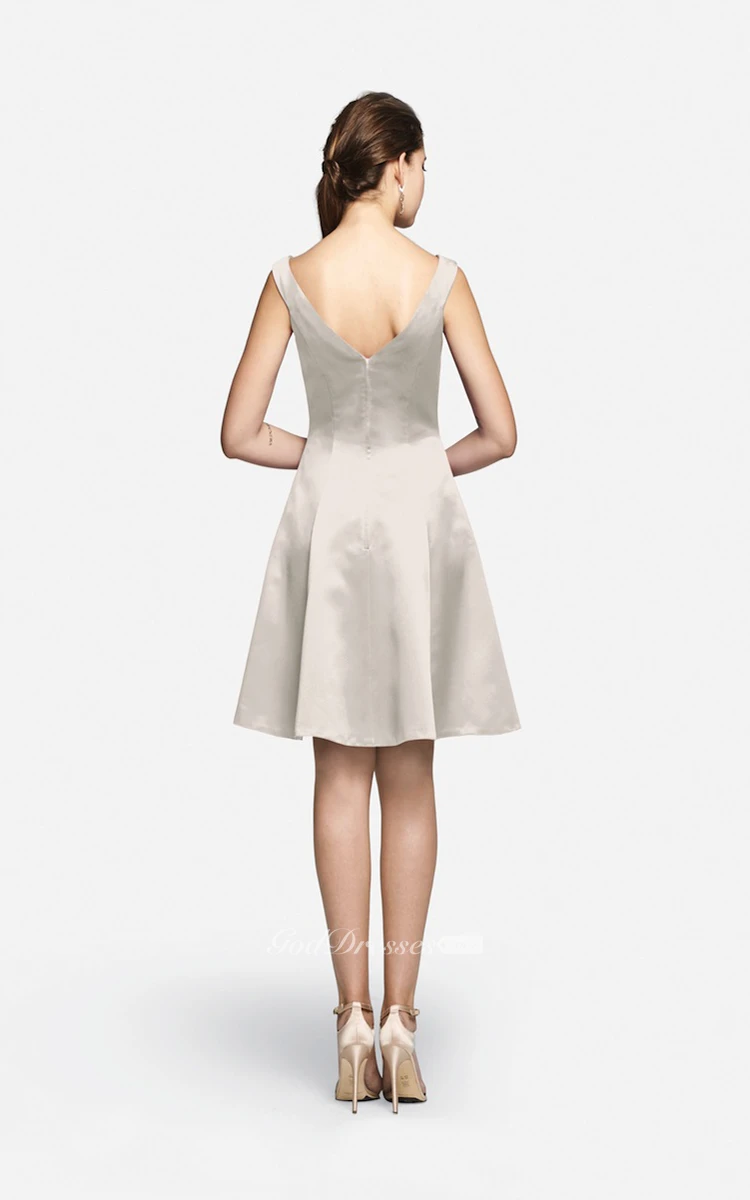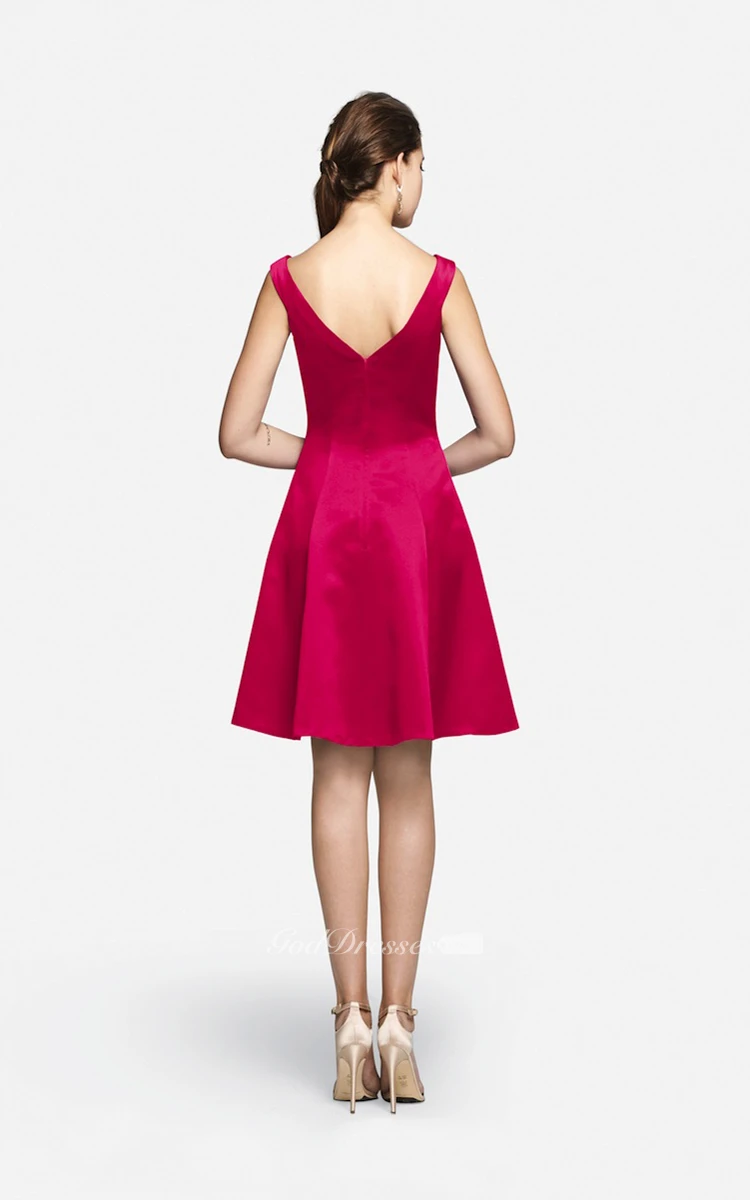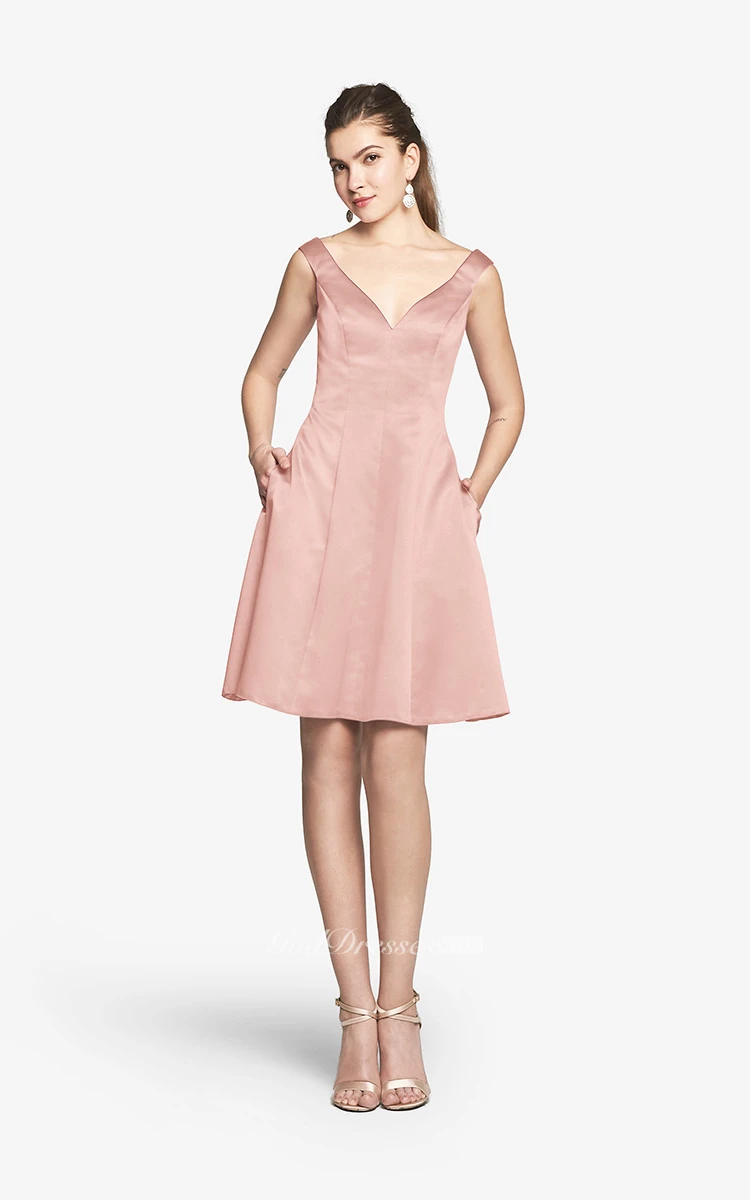 Charming Mini V Back Sleeveless A-Line Satin Dress With V-neck and Side Pockets