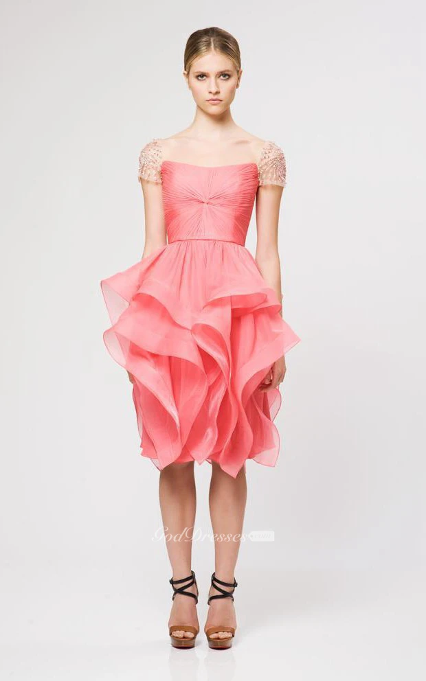 Cheap Sexy Bateau Neckline Beaded Capped Sleeves Tiers Skirt