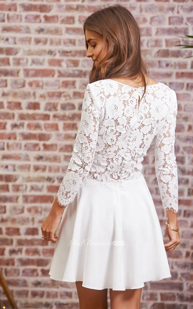 Chic Jewel Satin Lace Two Piece Long Sleeve Short Wedding Dress with Button