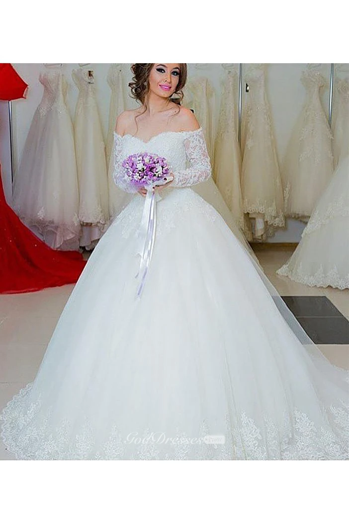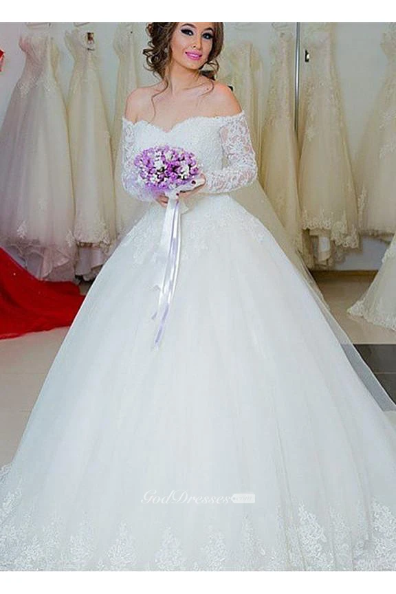 Chic Off-the-shoulder Lace Wedding Dress Tulle Ball Gown Long Sleeve