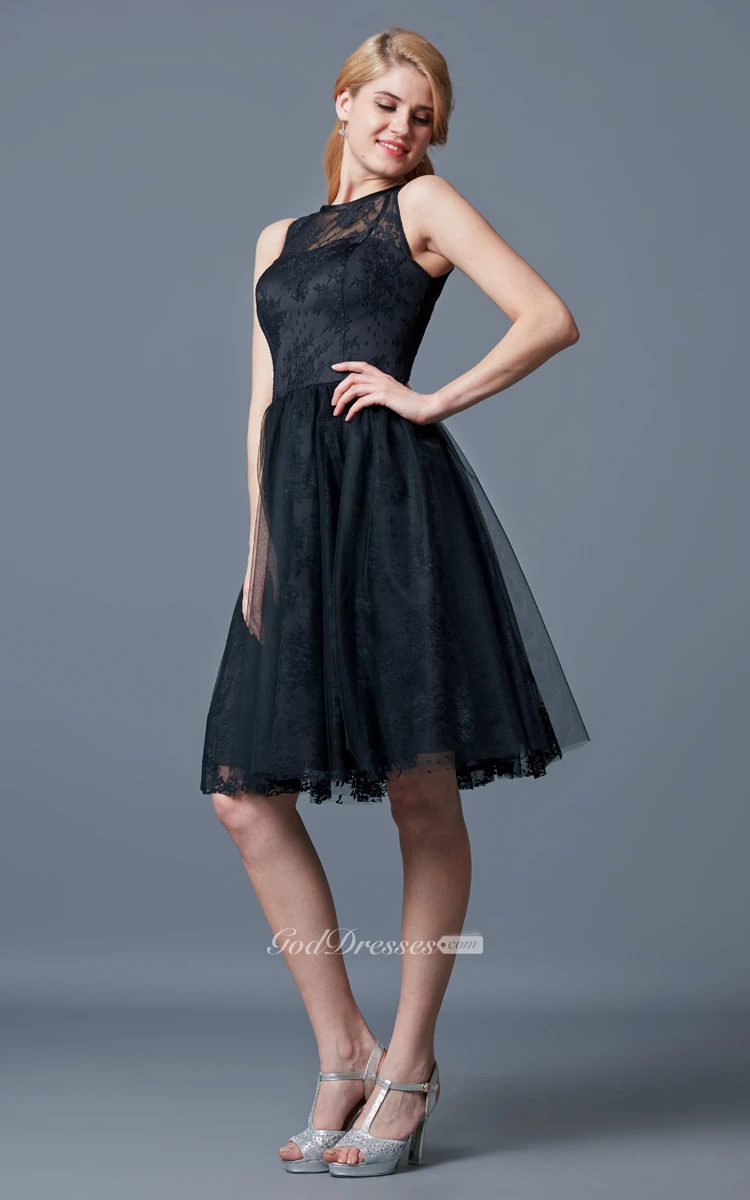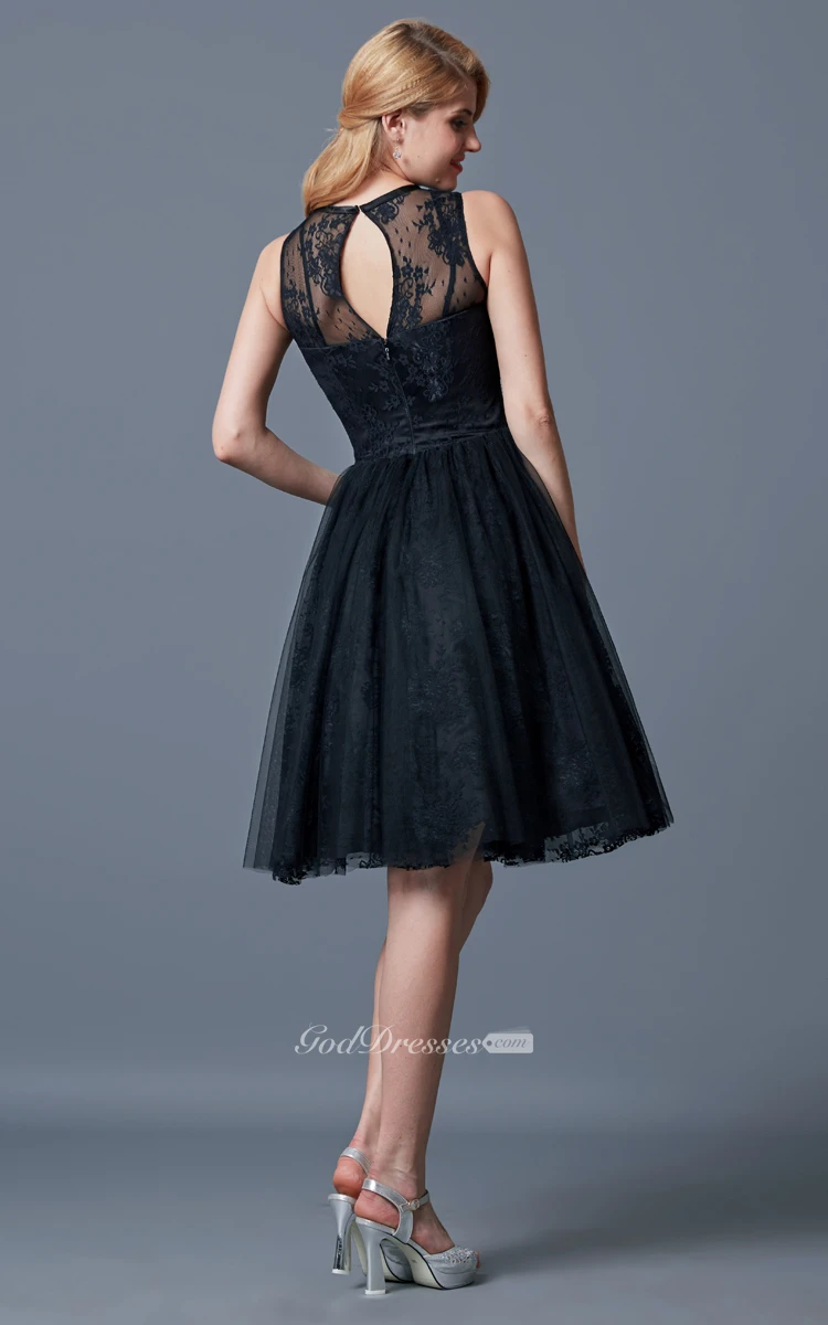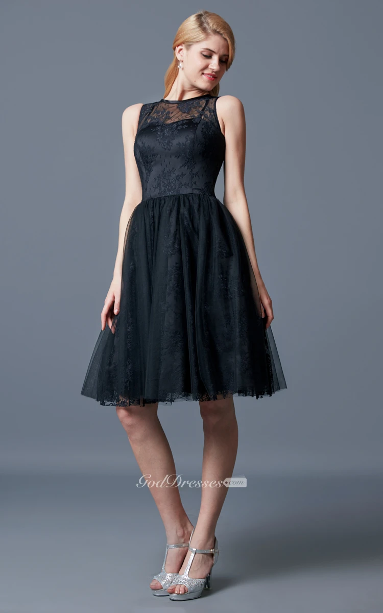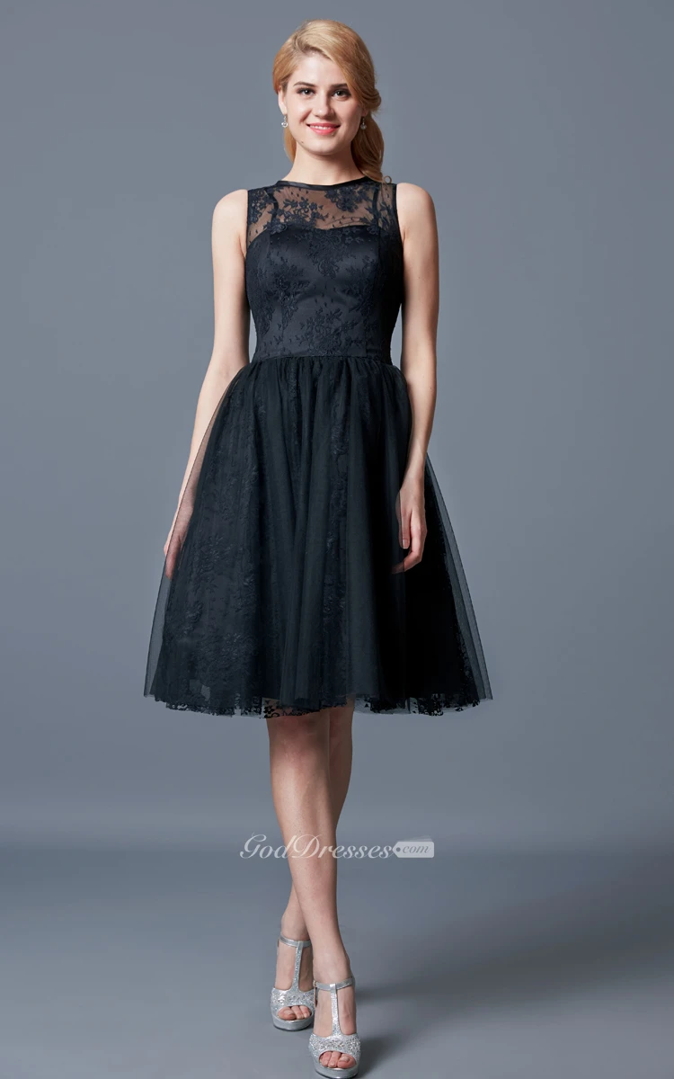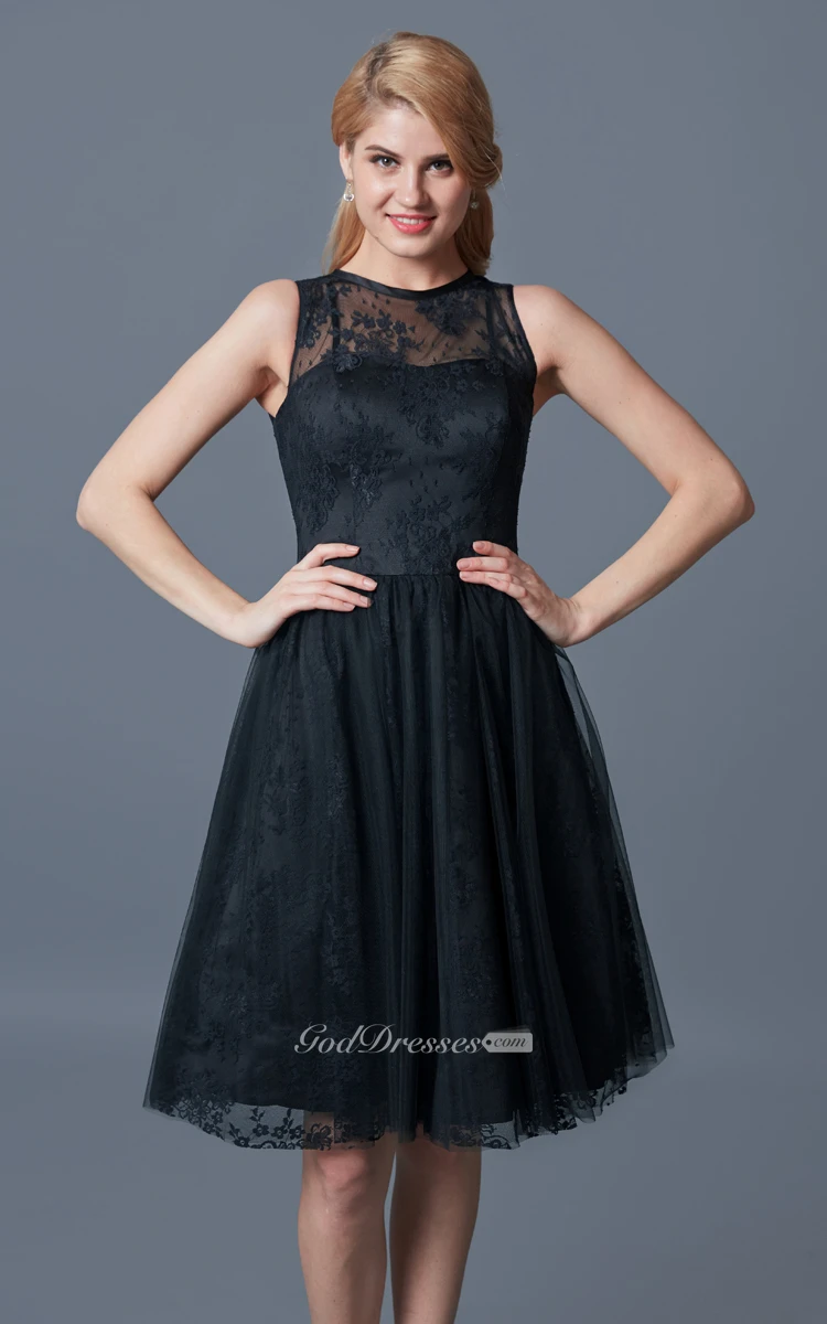 Chic Sleeveless A-line Knee-length Lace Dress With Illusion Neck