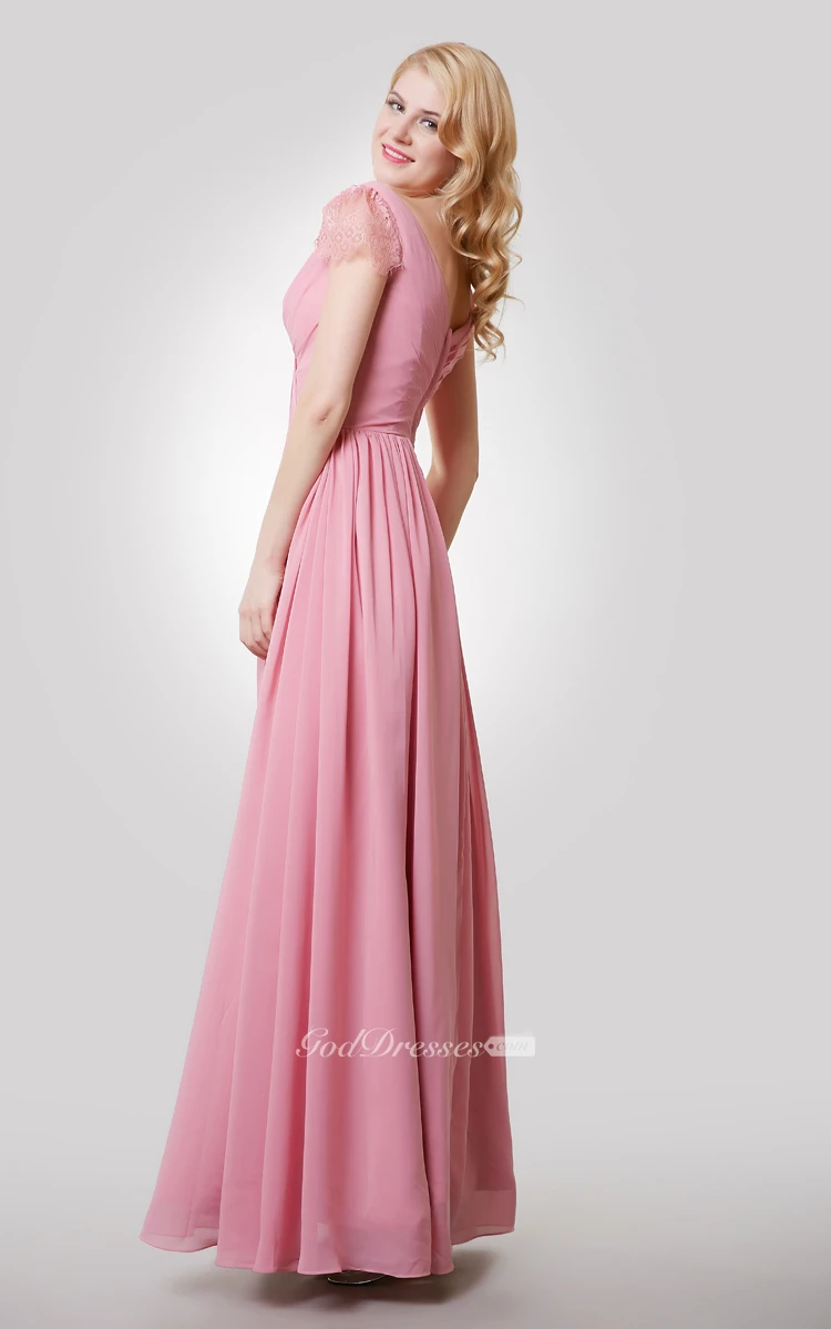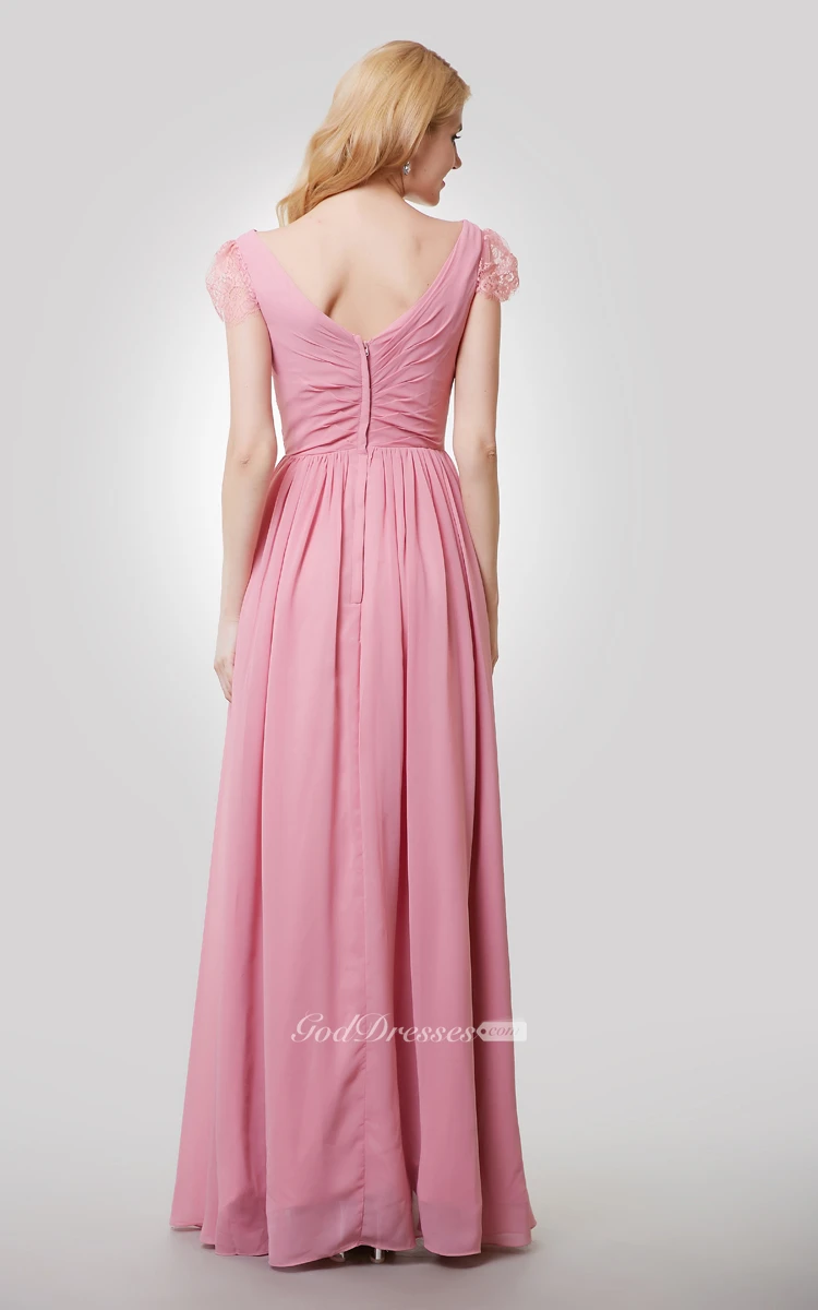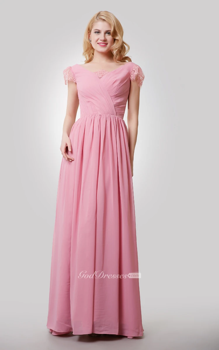 Chiffon A-Line Long Dress With V-Neck and Cap Lace Sleeves
