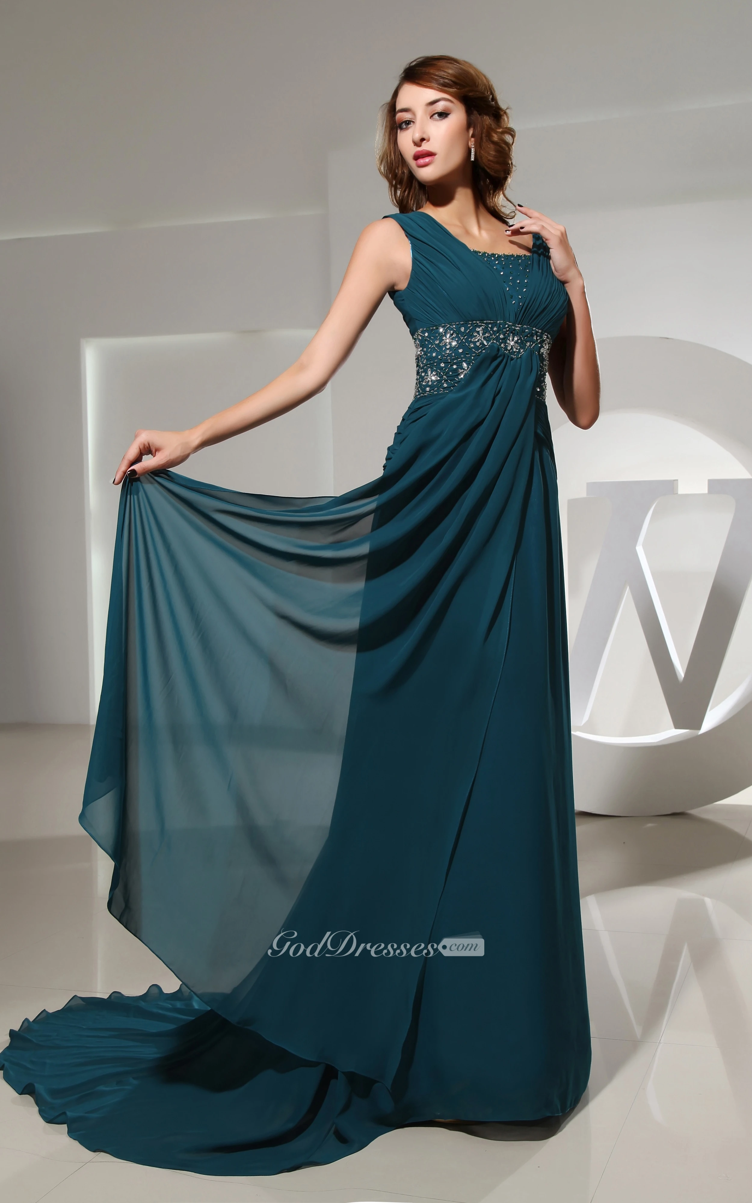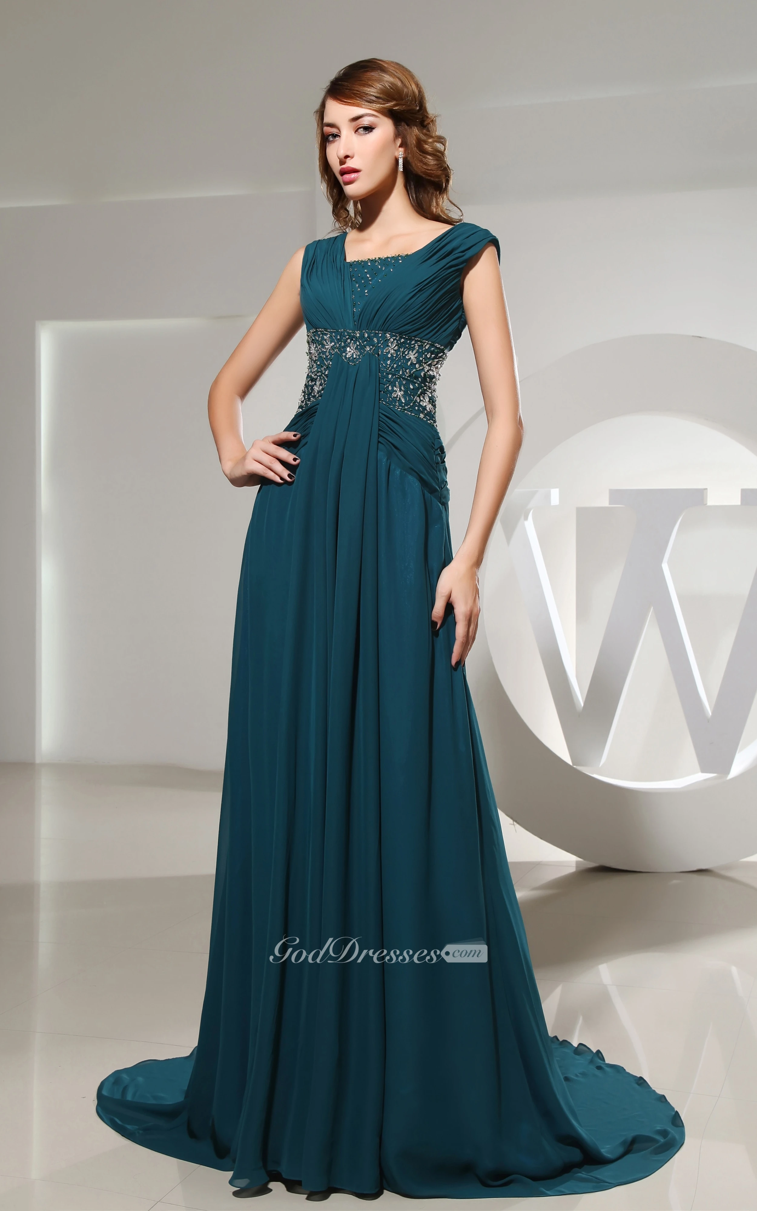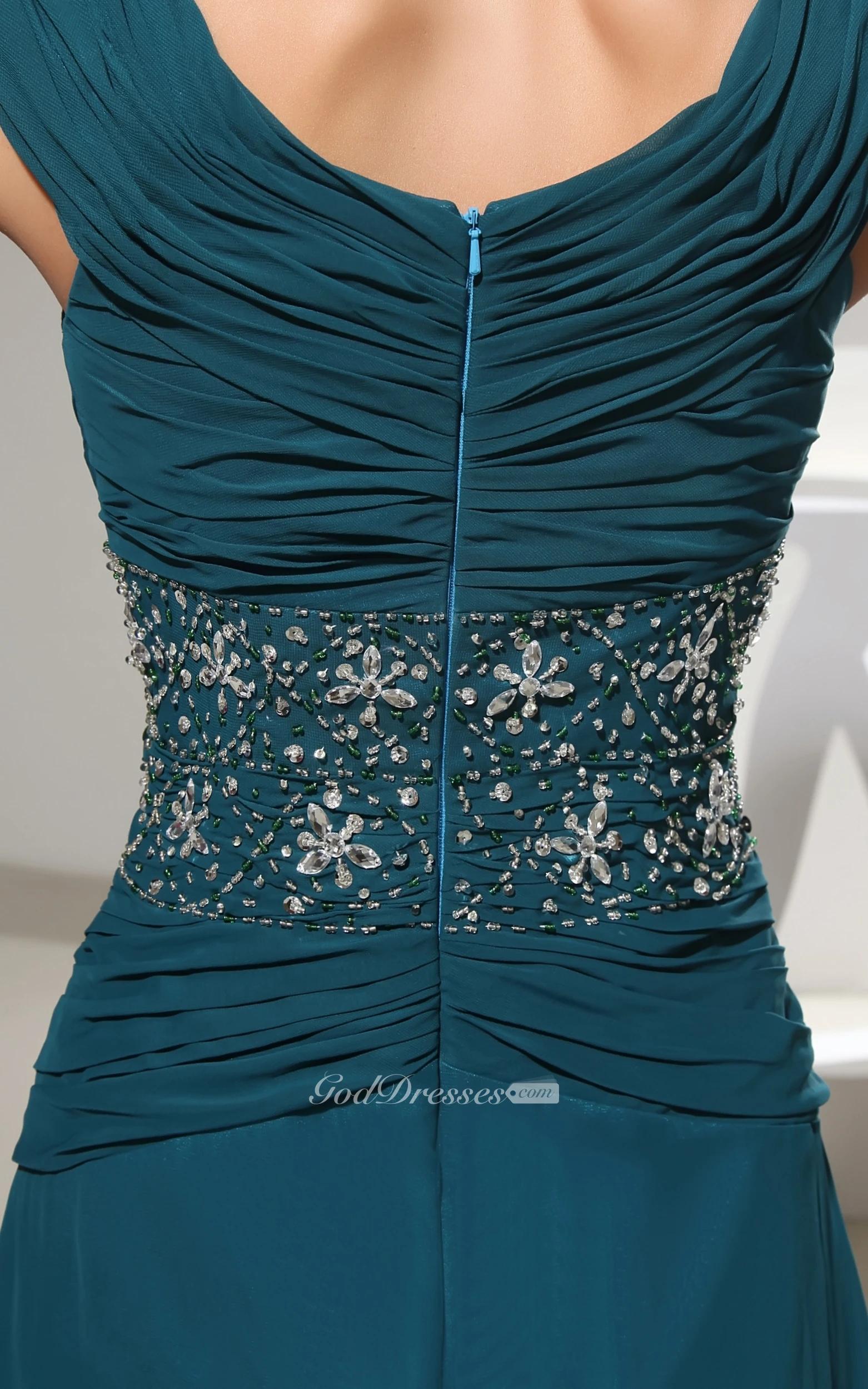 Chiffon Floor-Length Beaded Dress With Pleats and Ruching