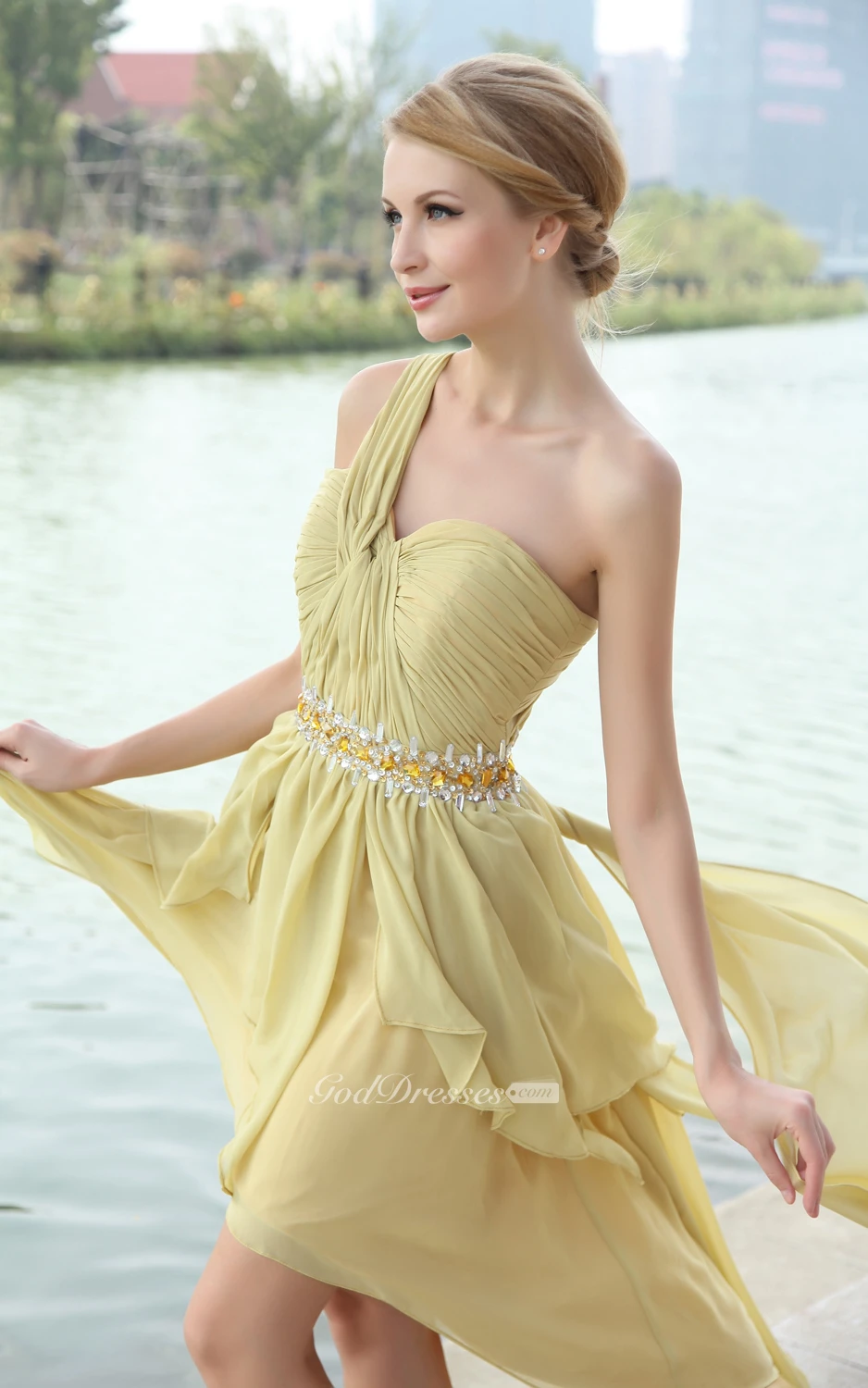 Chiffon High-Low One-Shoulder Dress With Beaded Waistband