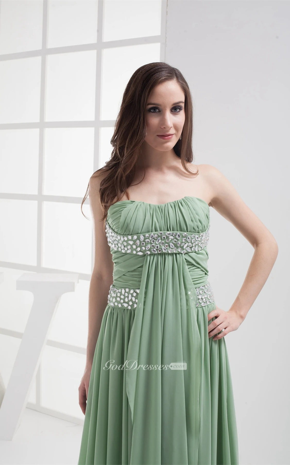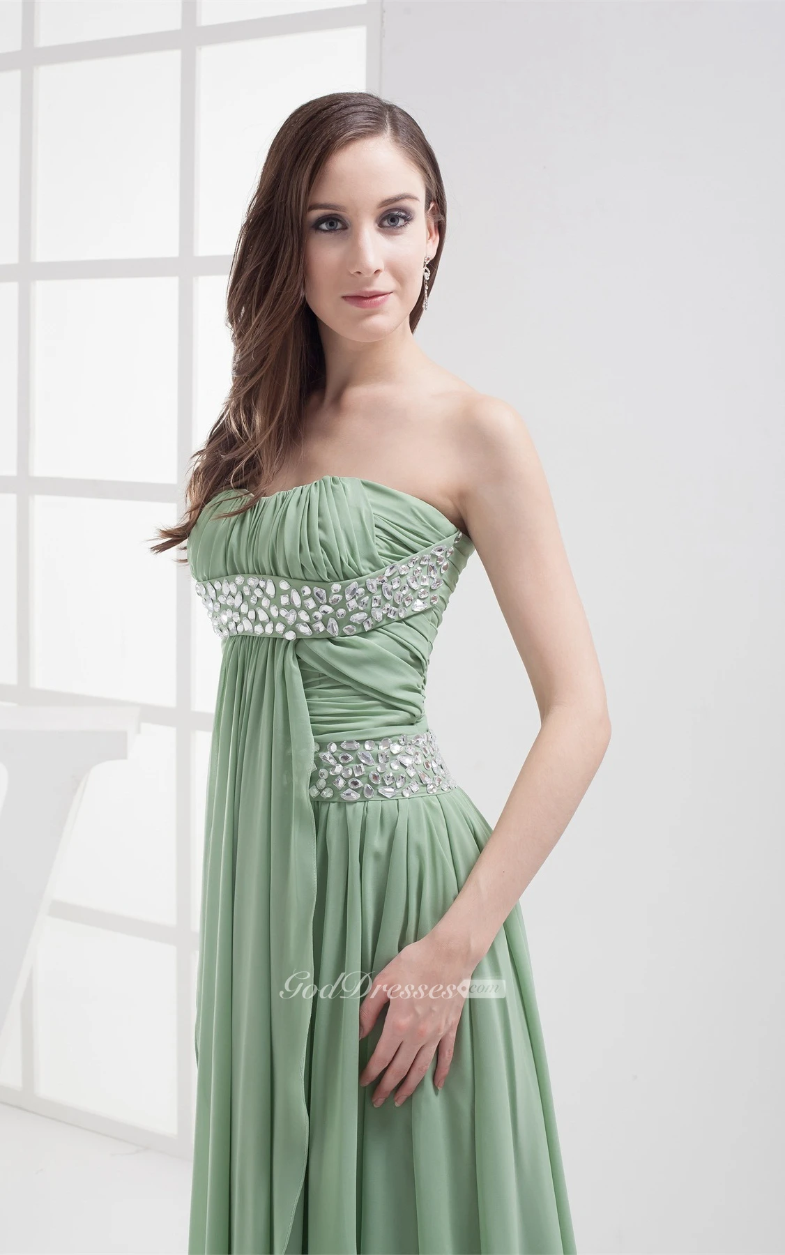 Chiffon Pleated Floor-Length Sleeveless Rhinestone and Dress With Ruching