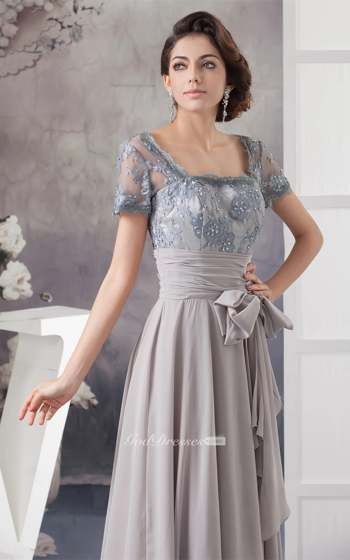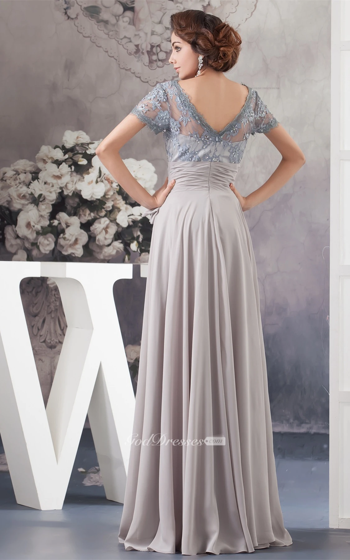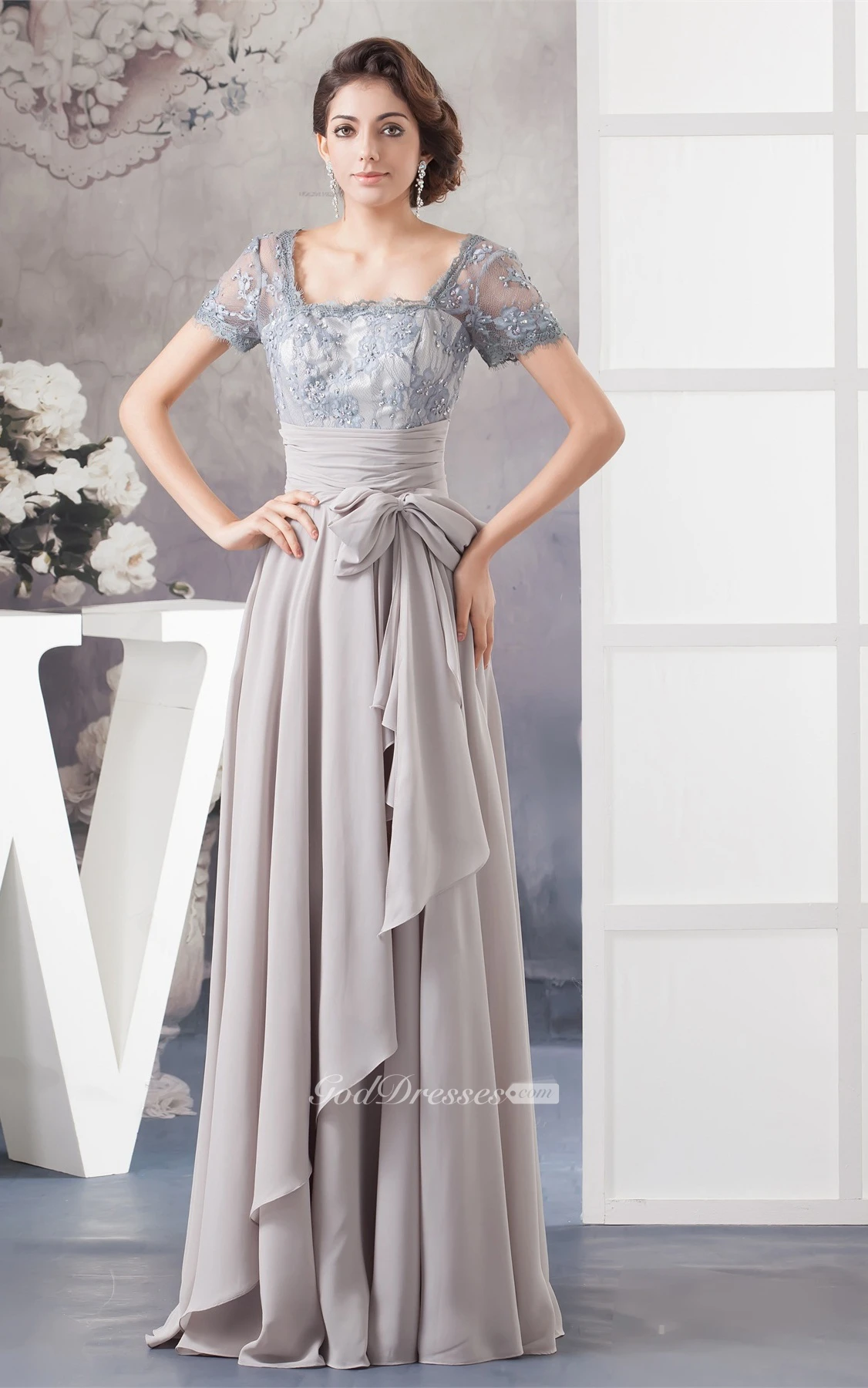 Chiffon Pleated Illusion Caped Sleeve and Gown With Bow