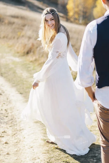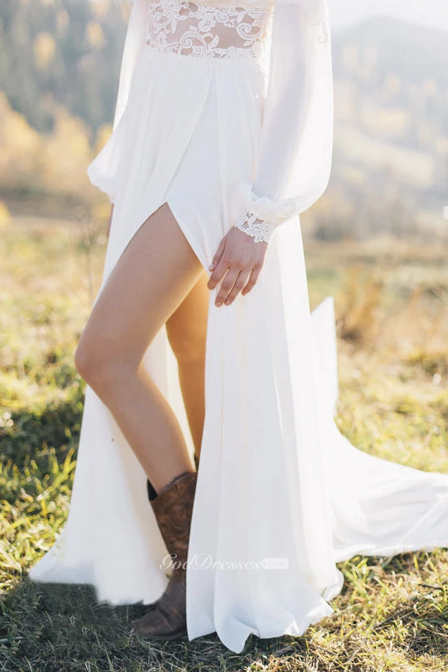 Chiffon Plunging Poet Long Sleeve Bohemian Wedding Dress With Lace Details And Front Split