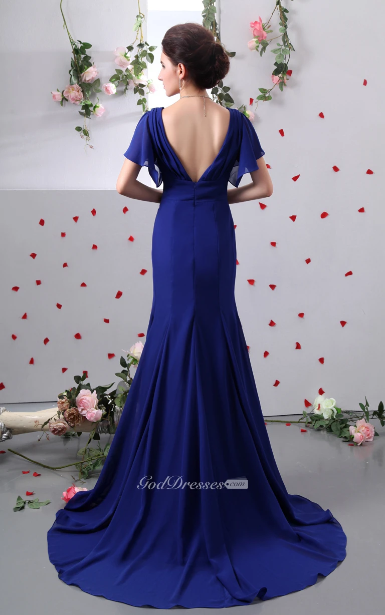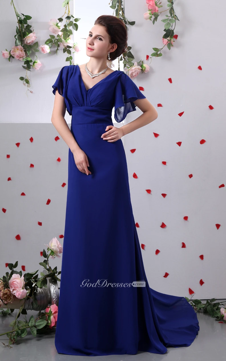 Chiffon V-Neck Caped Sleeve Sheath Dress With Brush Train