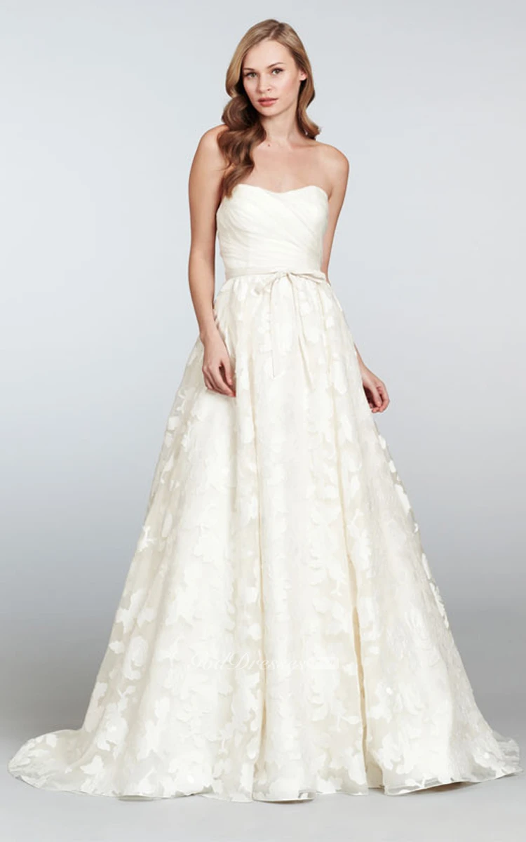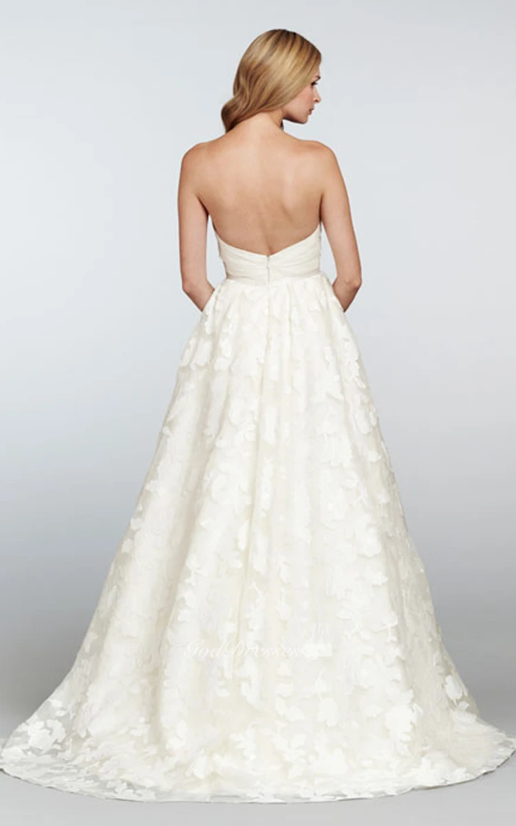 Make a gift for yourself choosing this stunning gown to frame your beauty during your special day. Strapless sweetheart neckline bodice is delicately ruched and cinches your body in slim fitting way. Natural waist is adorned with a ribbon forming a small bow. A-line patterned organza skirt flares to the feet and forms a sweep train behind.