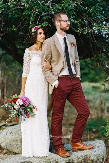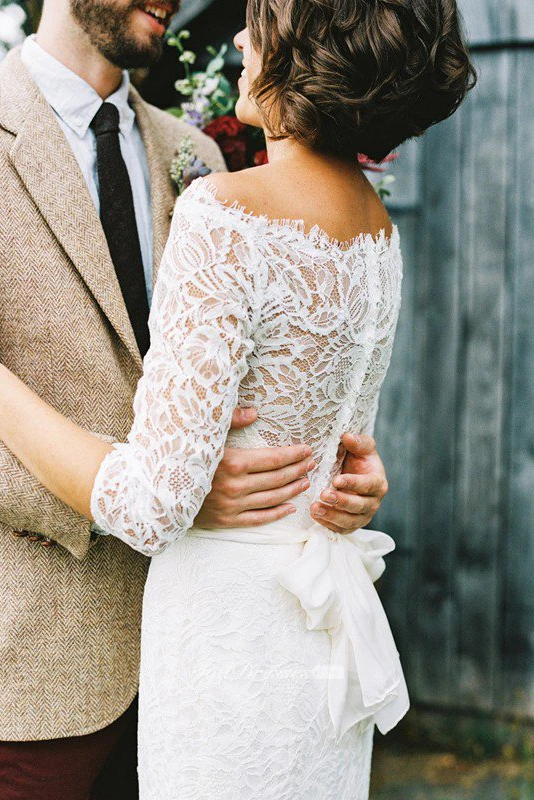 Column Sleeves Lace Off-the-shoulder Bowknot Brush Train Wedding Dresses