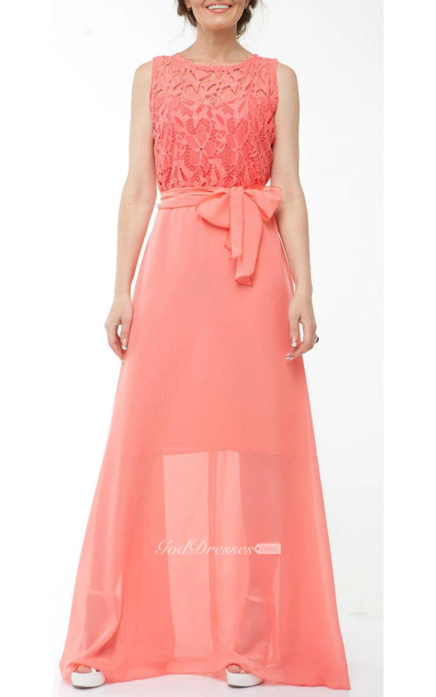 Coral Bridesmaid Chiffon Coral Evening Wedding Coral Lace Long Dress