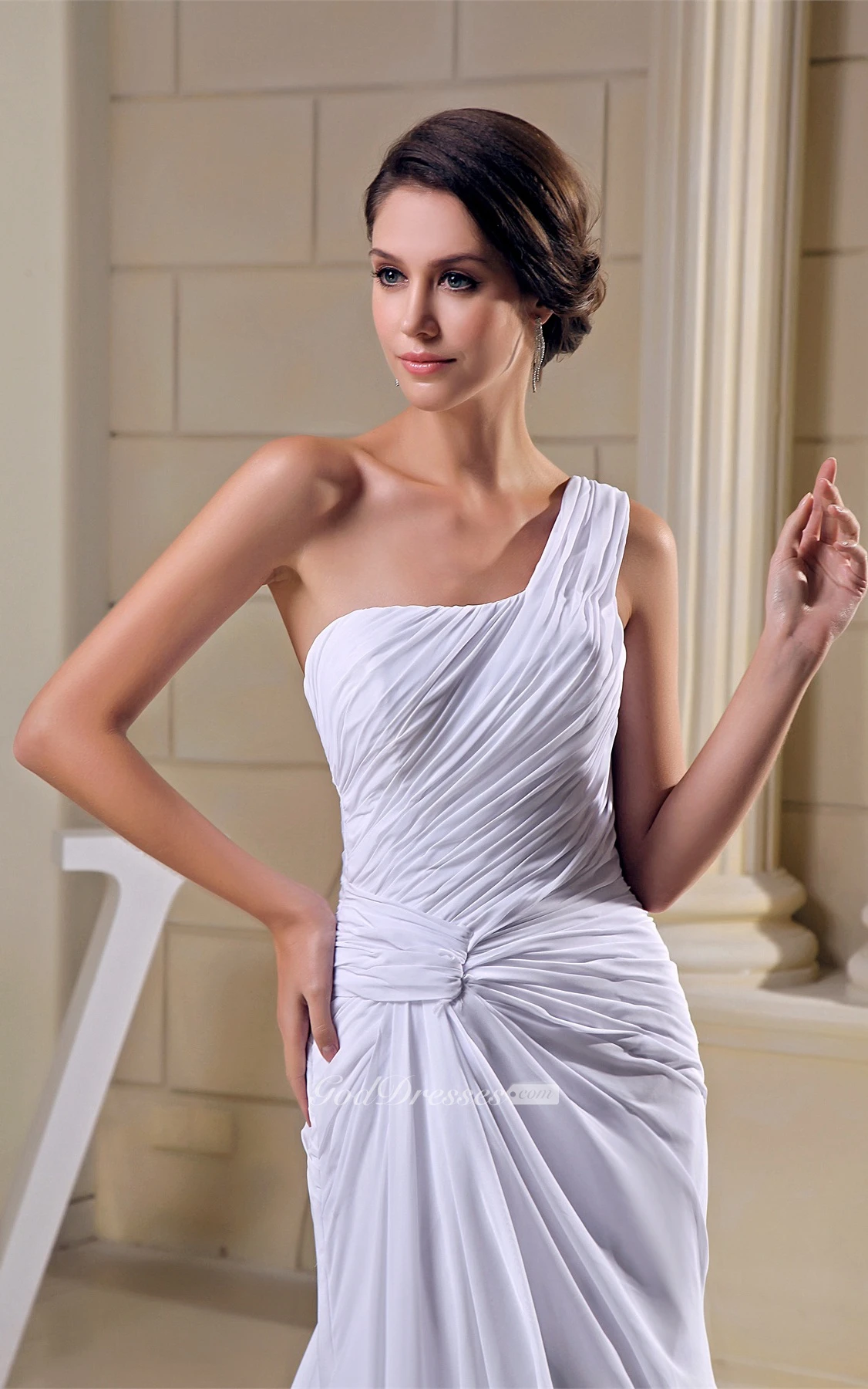 Criss Cross One Shoulder Ruched Chiffon Gown With Pleats and Court Train