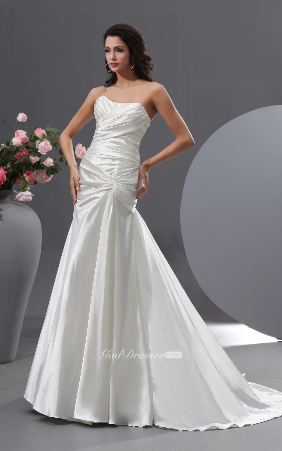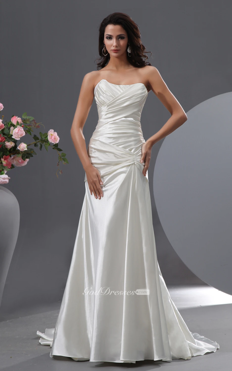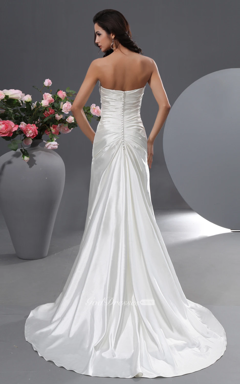 Criss-Cross Ruching Streched Sating Dress With Court Train