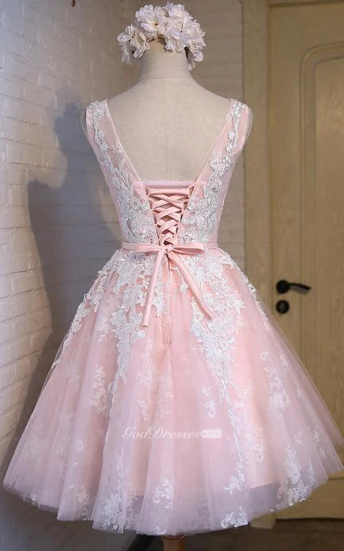 Cute Scoop Sleeveless Lace Up A-line Lace Dress