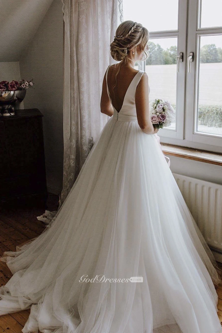 Deep V-back Ethereal Sleeveless Ball Gown With Bow And Tulle Wedding Dress