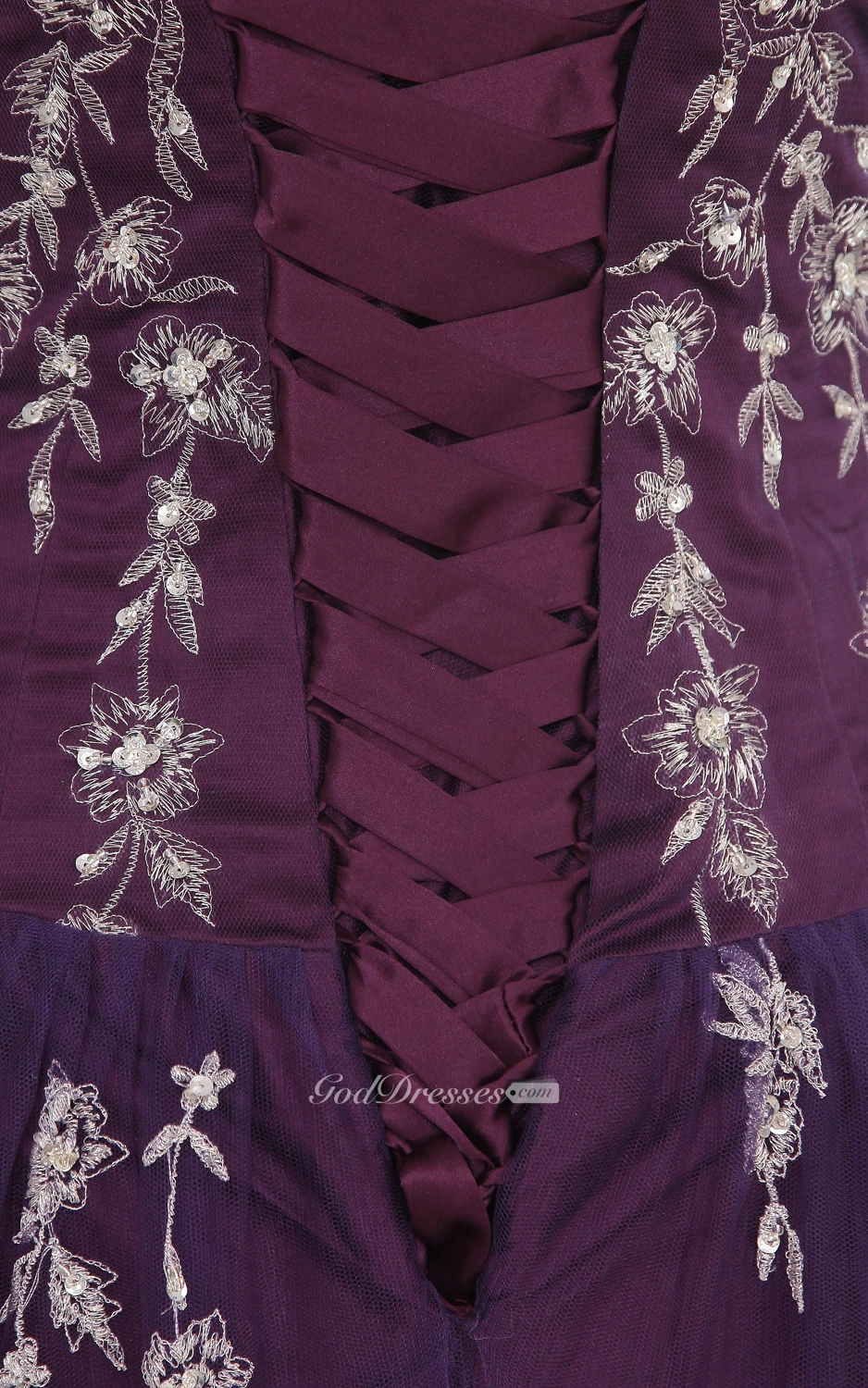 Deep V-Neck A-Line Dress With Lace Appliques and Tulle Overlay