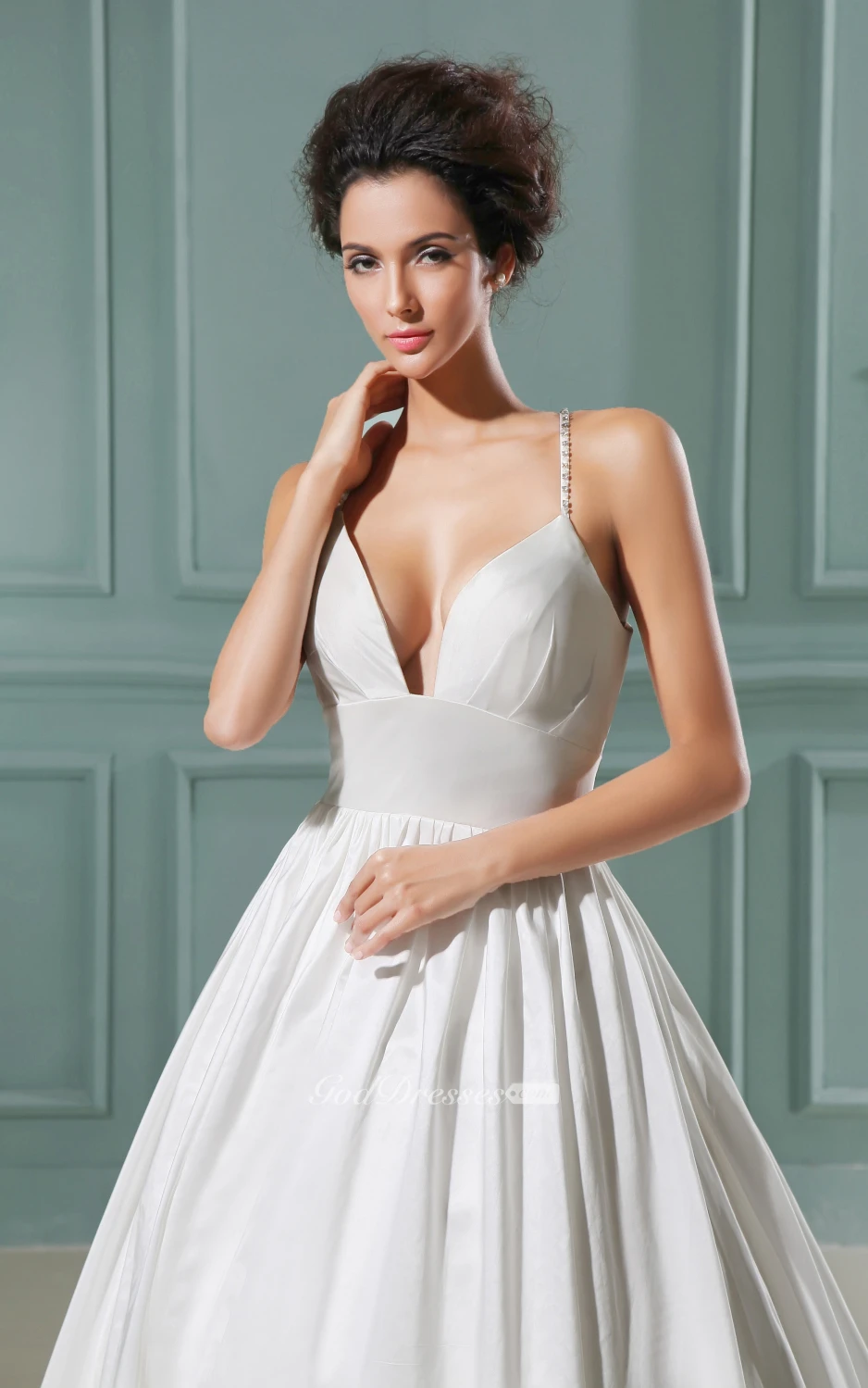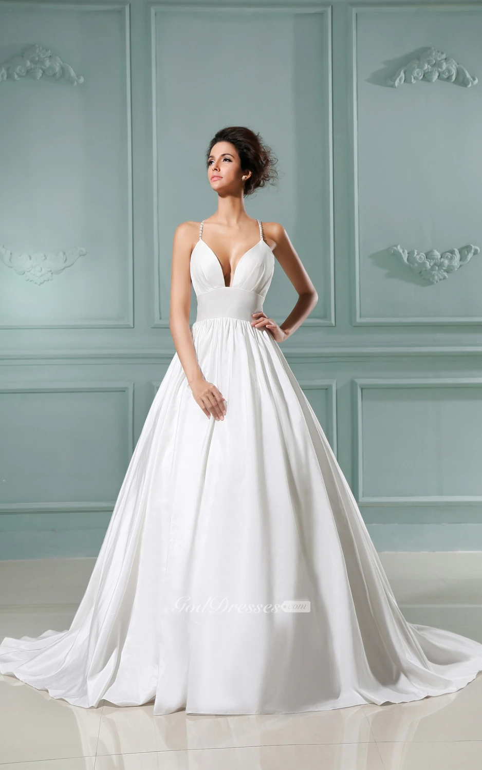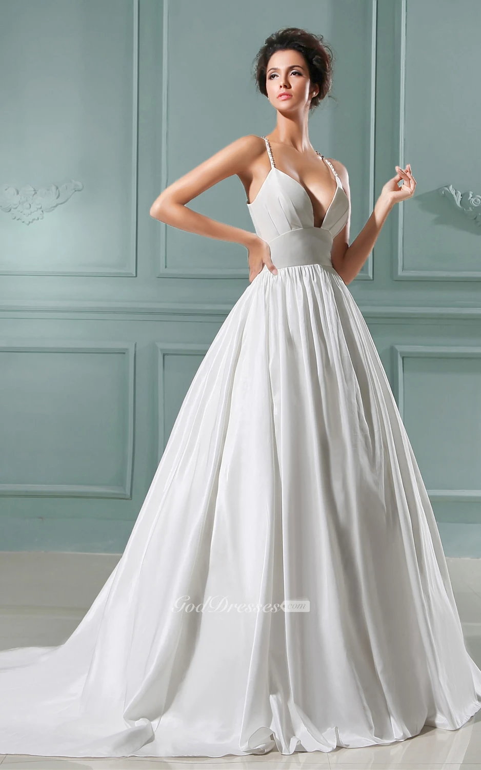 Deep V-Neck A-Line Dress With Spaghetti Straps Brush Train