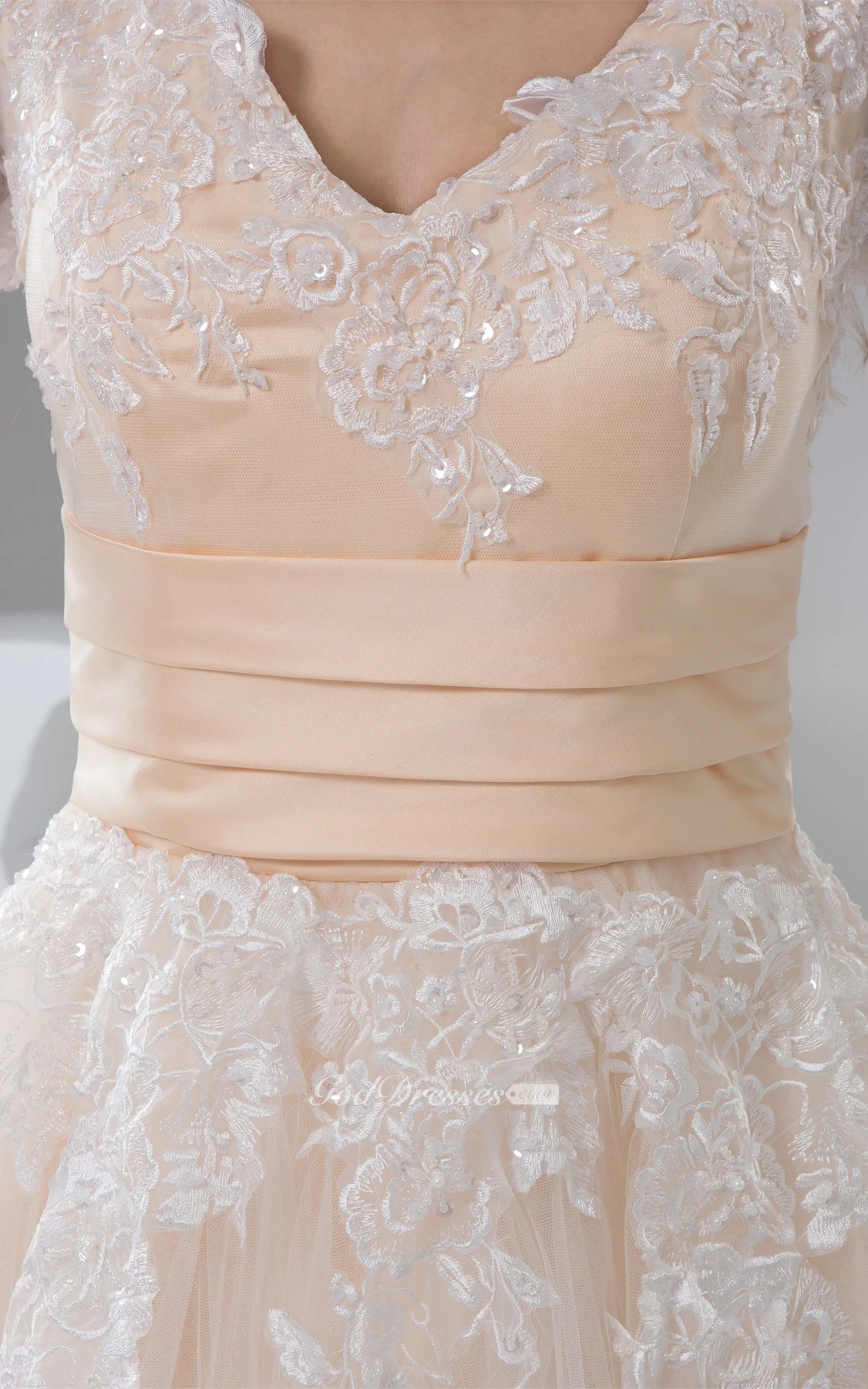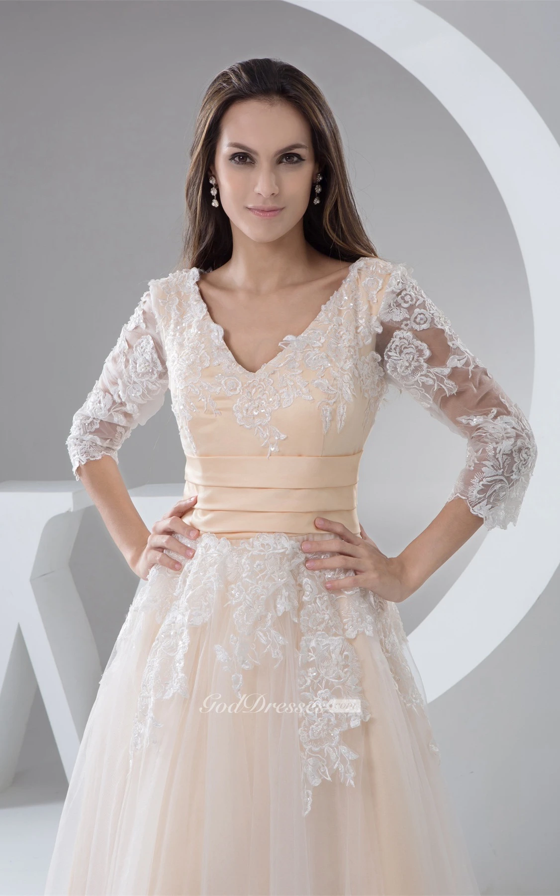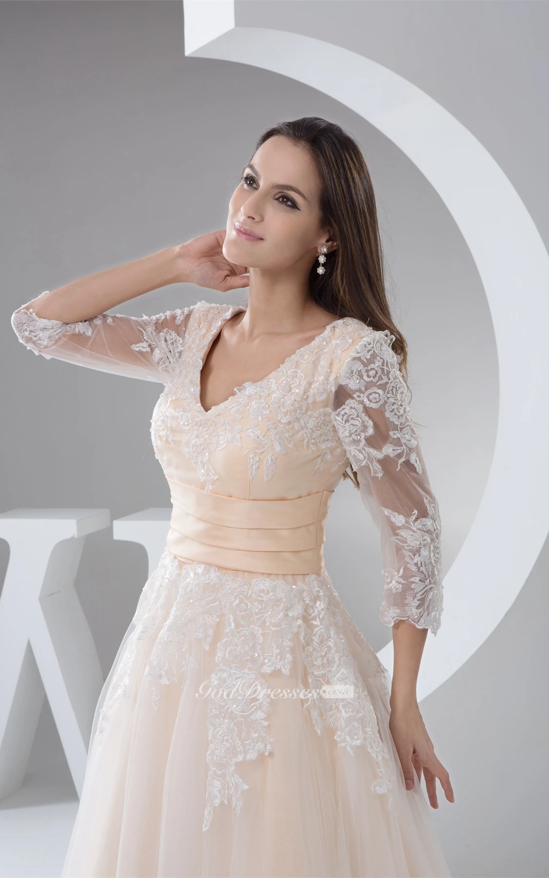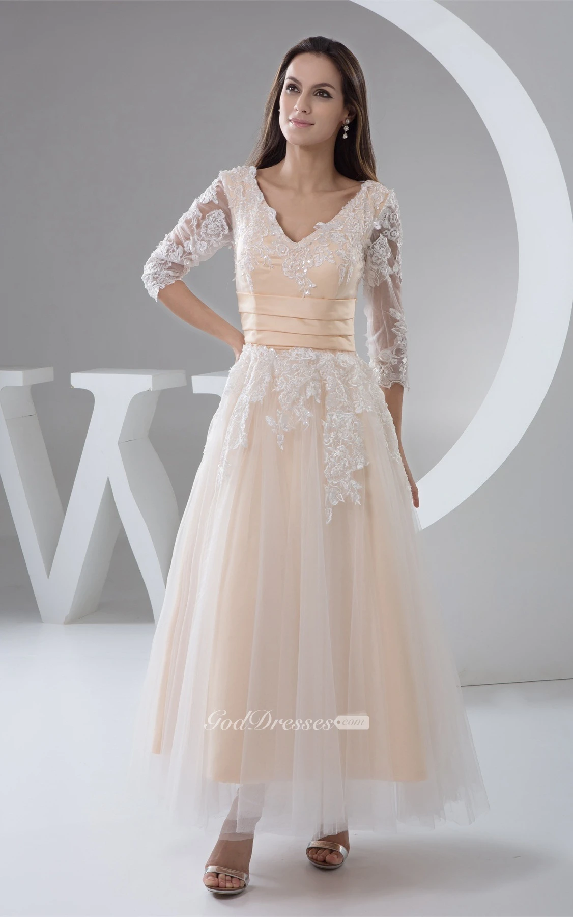 Deep-V-Neck Half-Sleeve Ankle-Length Lace Dress With Pleats