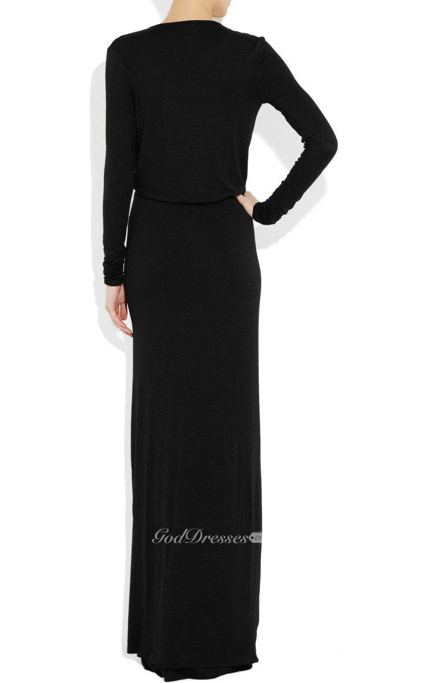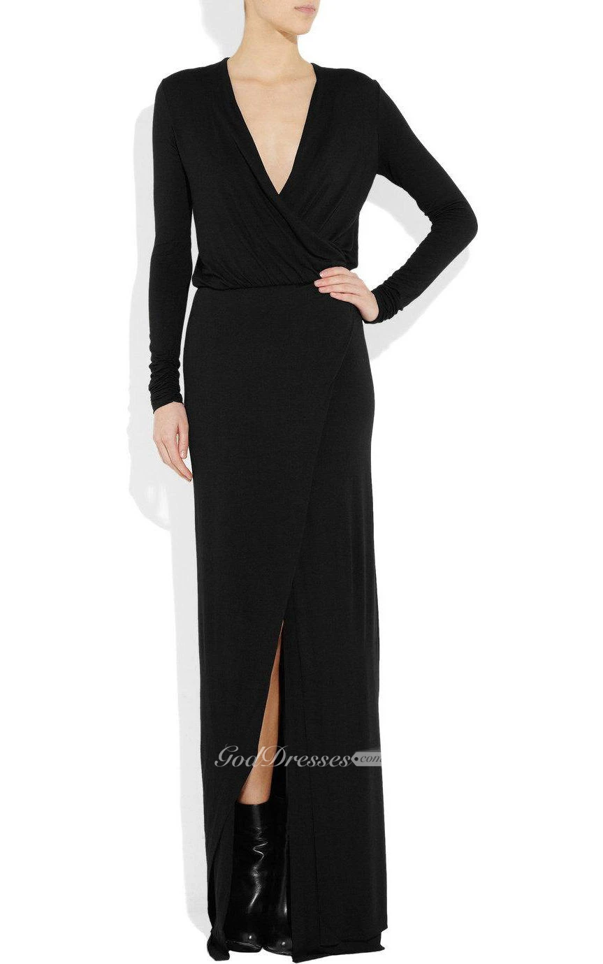 Deep V-neck Long Sleeve Sheath Long Jersey Dress With Belt and Split