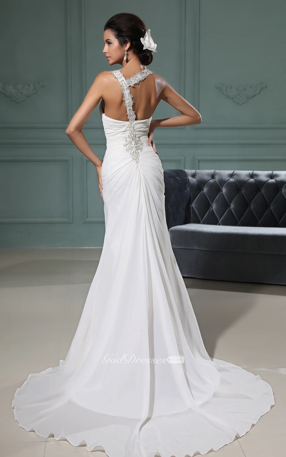 Deep V-Neck Ruching Sheath Chiffon Dress With Brush Train