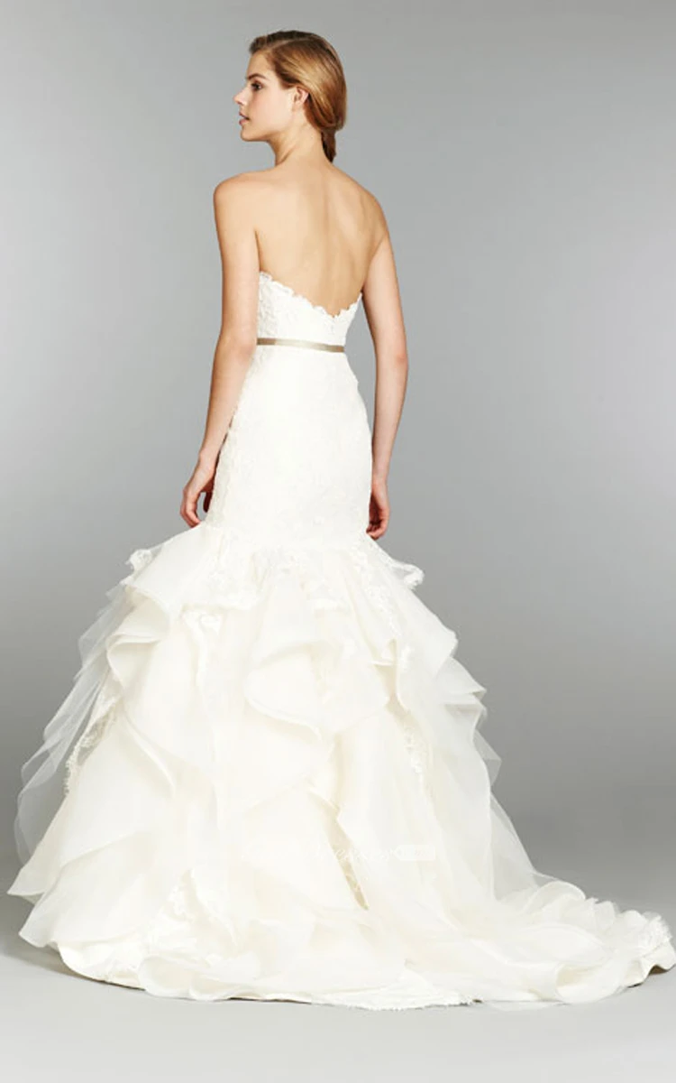 Make yourself a gift by choosing this exquisite gown to shine in on your special day. Delicate sweetheart neckline strapless lace bodice gently ties you in the slim fitting silhouette till the hipline from where the mermaid ruffled organza flimsy skirt with lace insets cascades to the feet forming a court train behind. Detachable off-shoulder lace bolero ideally complements the gown letting you create two different images and moods. Thin silky ribbon adorns the waist.