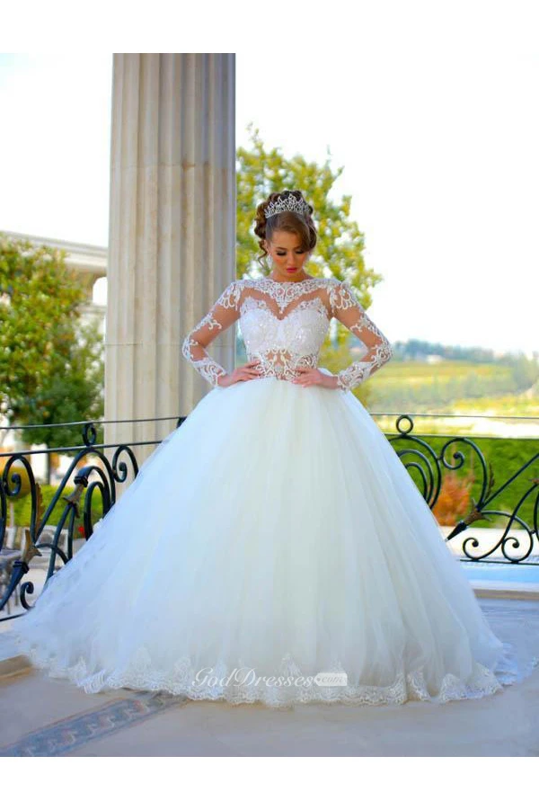 Delicate Long Sleeve Tulle Wedding Dress Ball Gown Lace Appliques