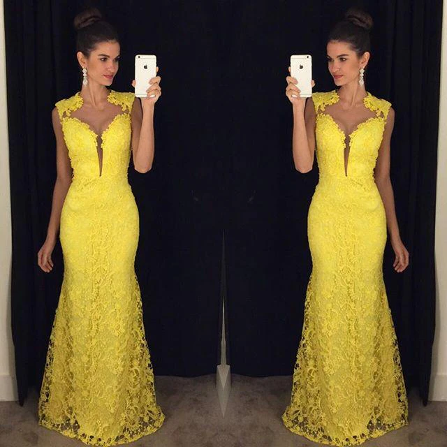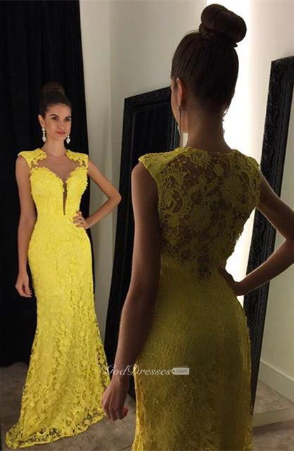 Delicate Yellow Lace Prom Dress Mermaid Sweep Train