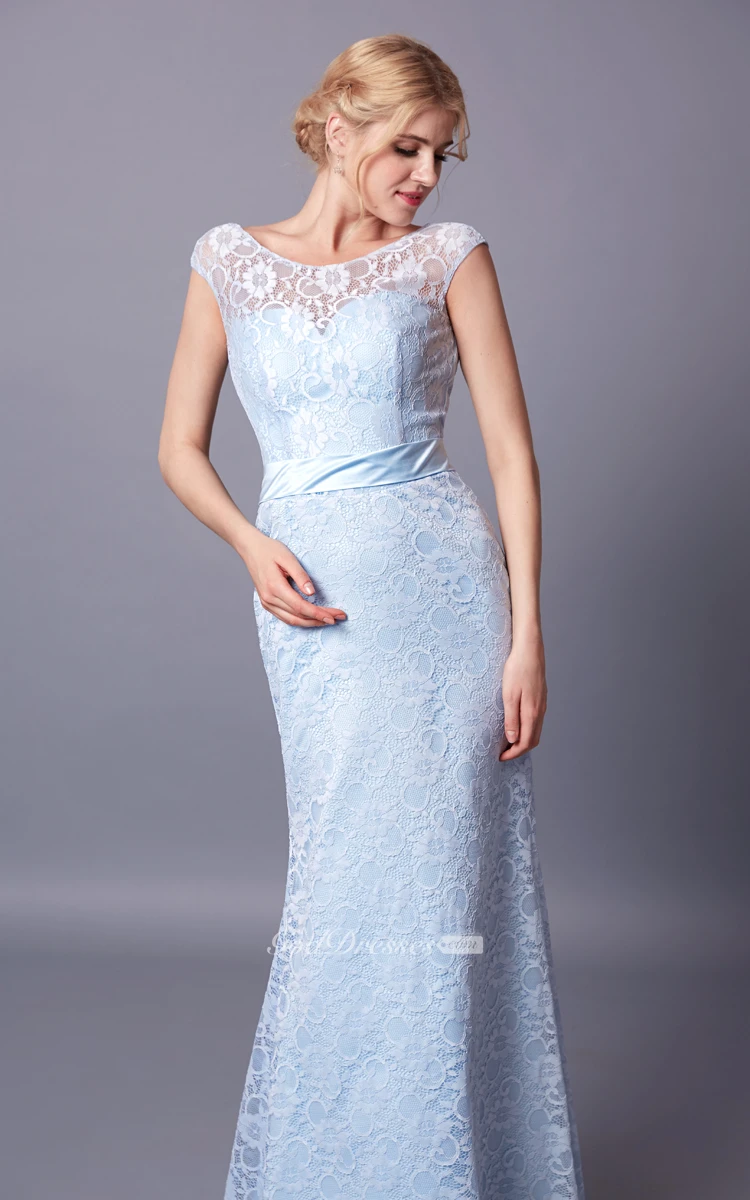 Demure Cap Sleeve Jewel Neck Long Lace Dress With Sash