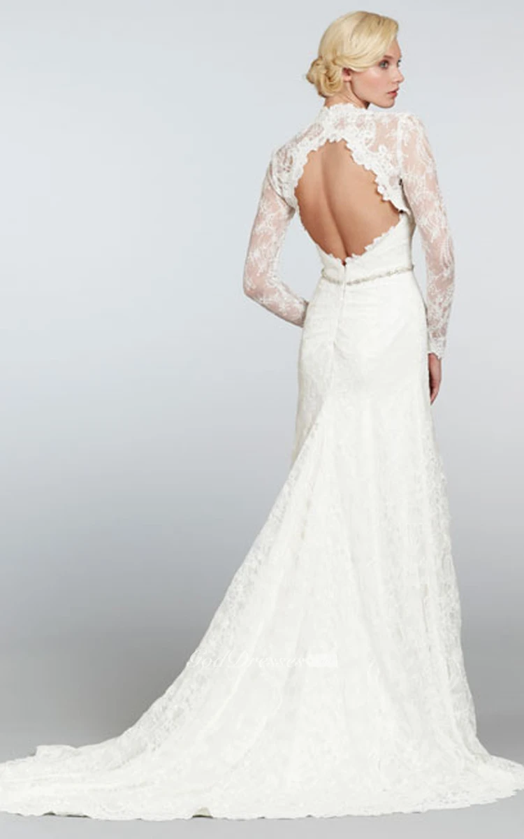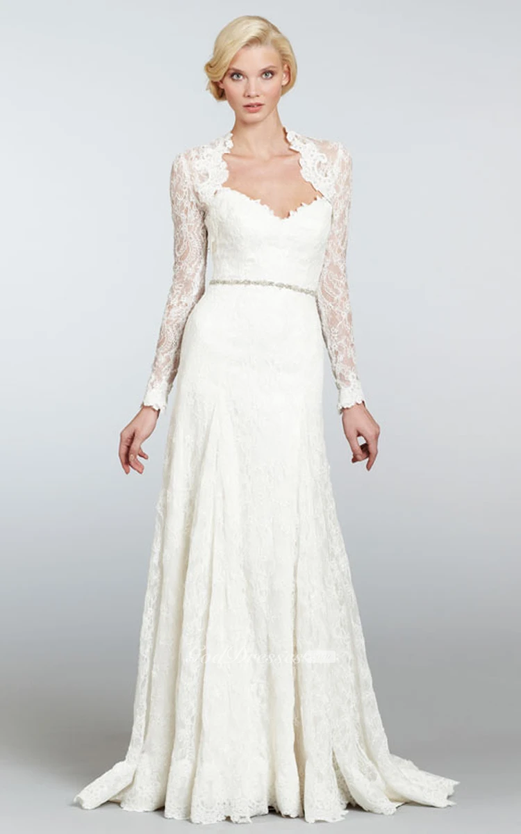 This stupefying chapel train delicate lace gown will make your fiance and guests feel an angel descended from heaven. Strapless sweetheart neckline bodice embraces you in a slim fitting silhouette. A-line skirt softly flares to the feet forming graceful folds. Natural waist is adorned with thin shimmering beaded belt. Detachable gentle lace long sleeved key-hole back bolero drapes the shoulders.