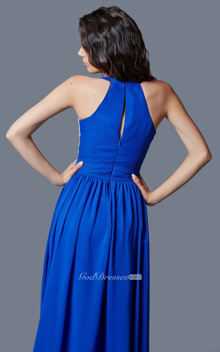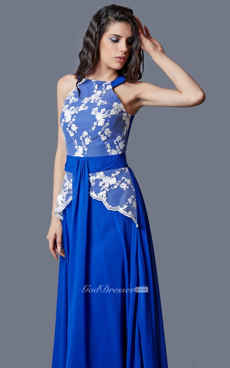 Demure Sleeveless High Neck Long Chiffon Dress With Lace Bodice