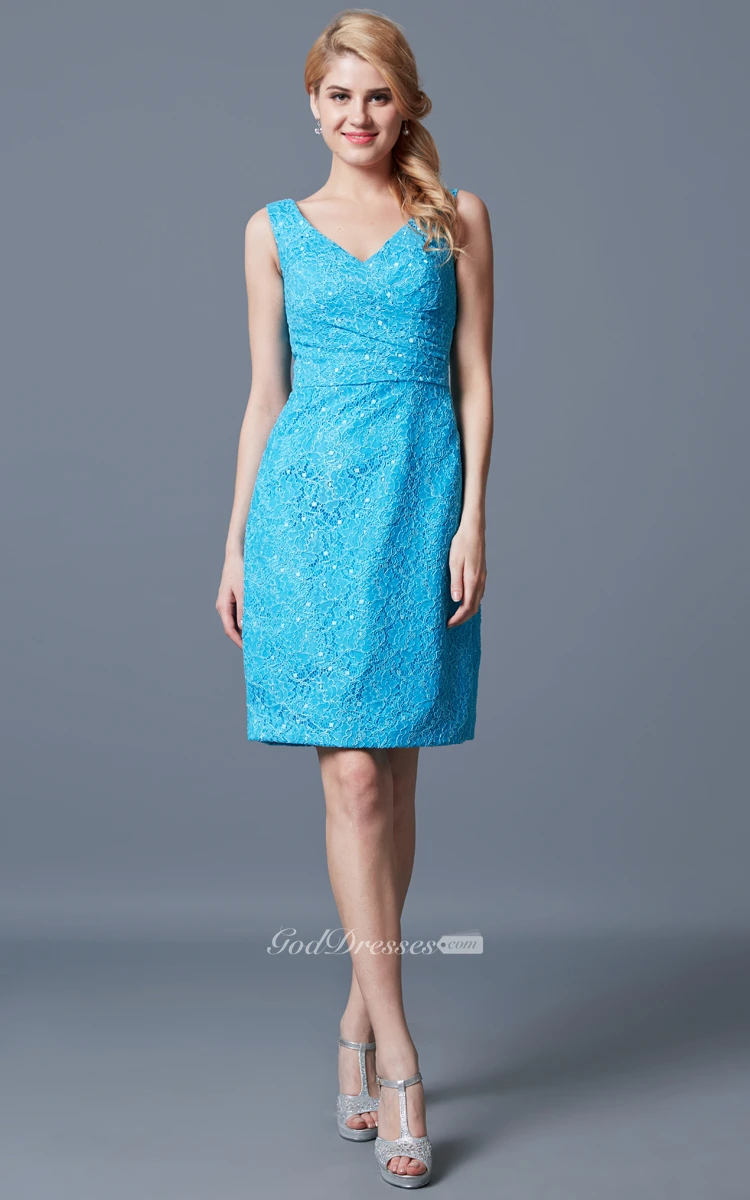Demure Sleeveless V-neck Sheath Short Lace Dress