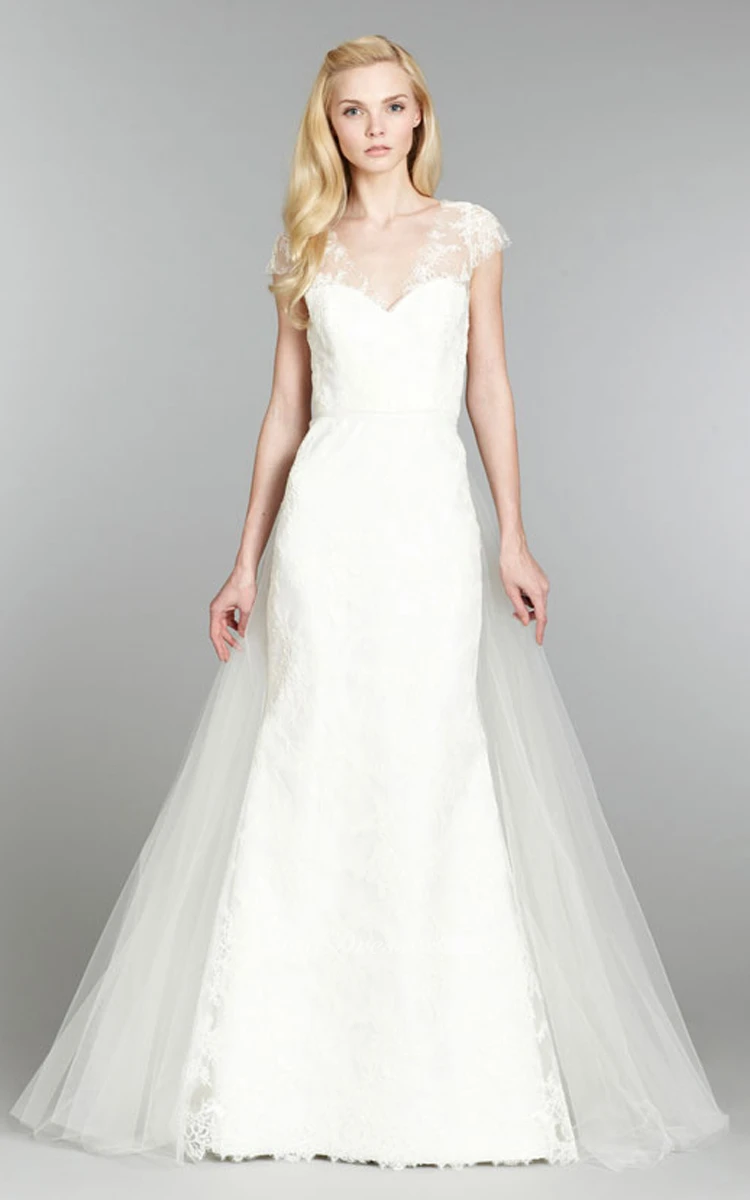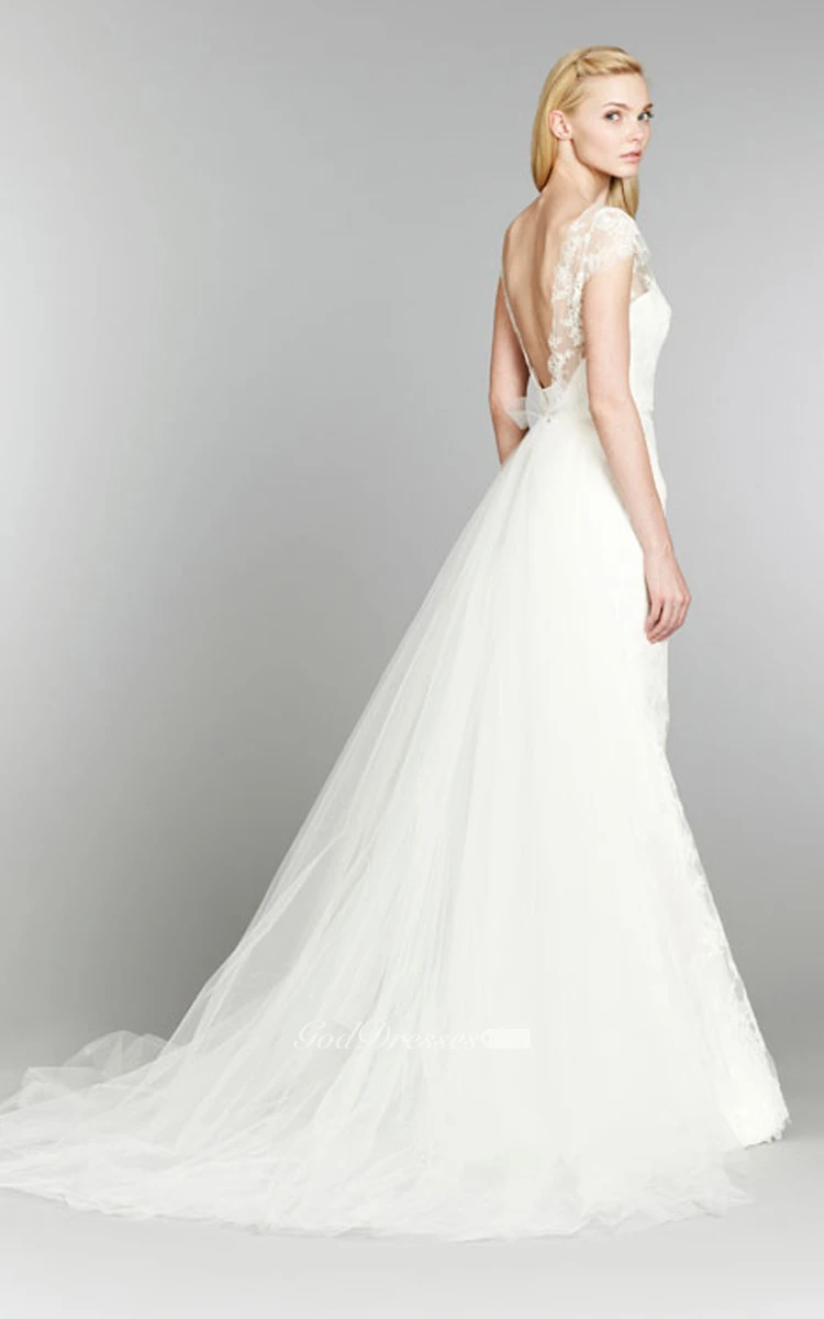 Demure V-Neck Cap Sleeve Lace Dress With Detachable Tulle Train