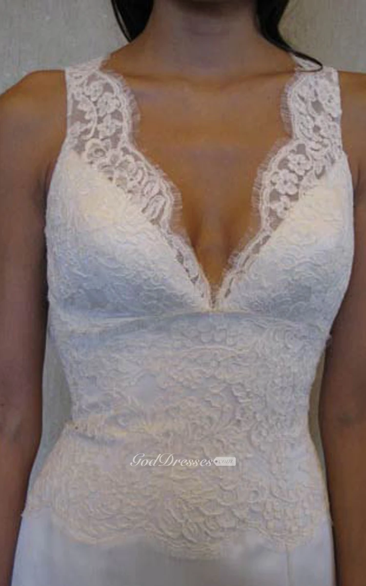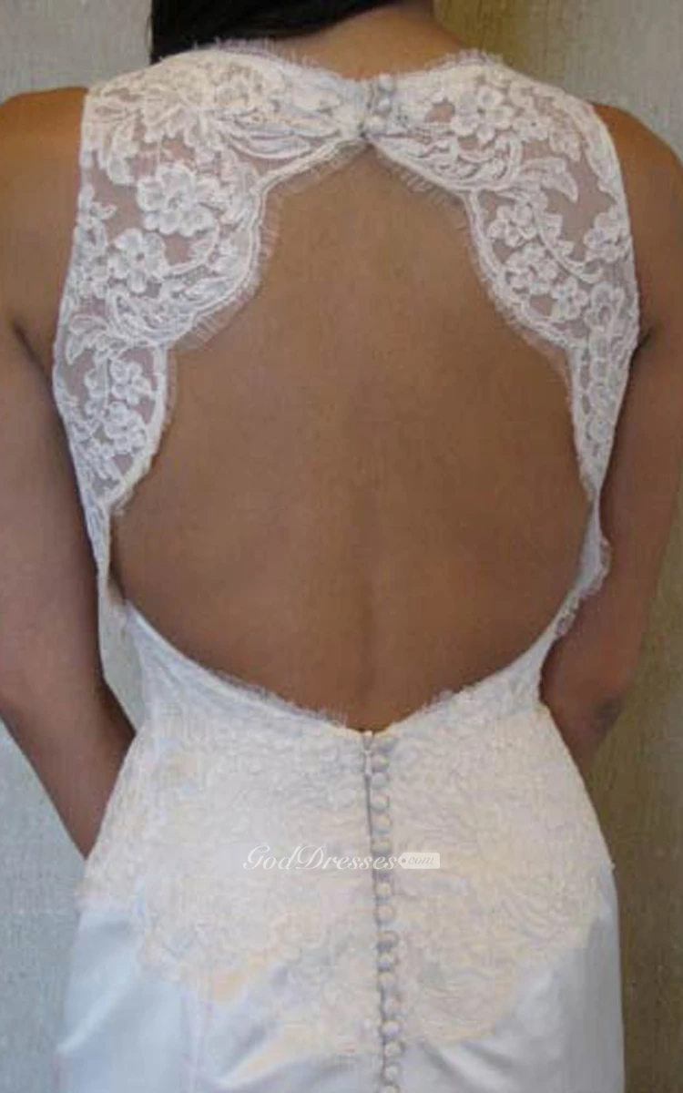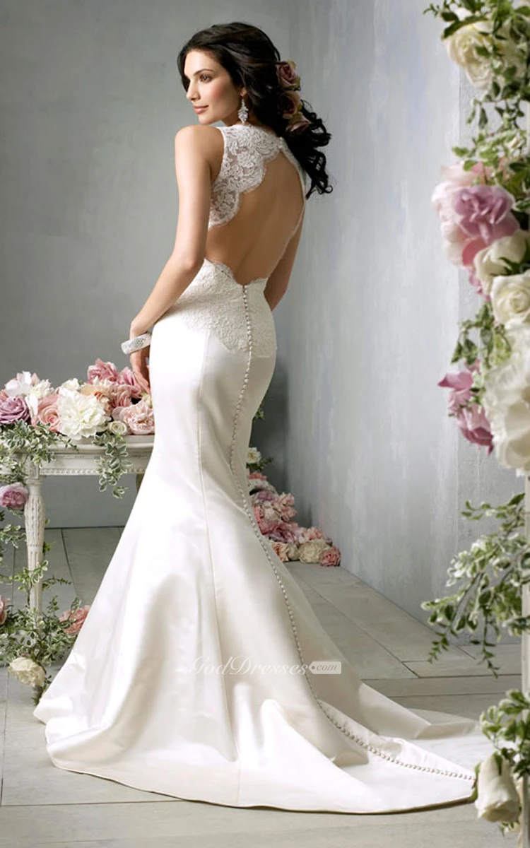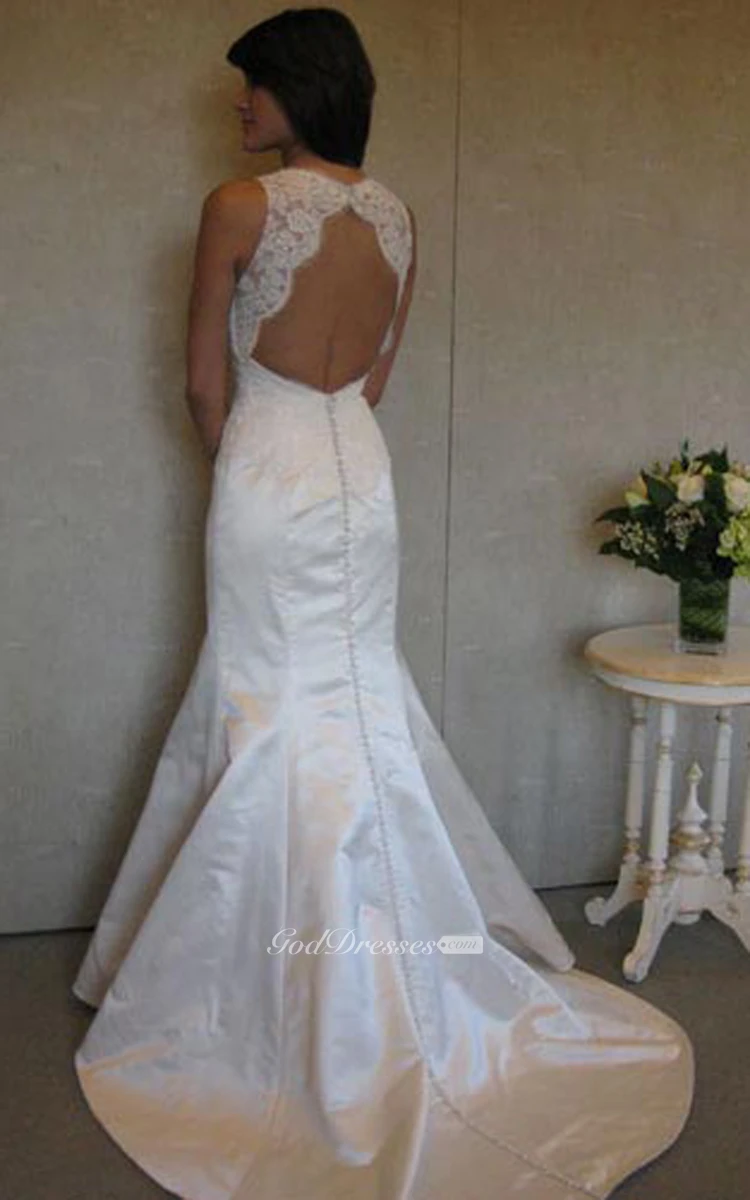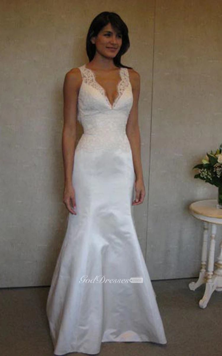 Demure V-Neck Lace Bodice Satin Mermaid Gown With Open Back