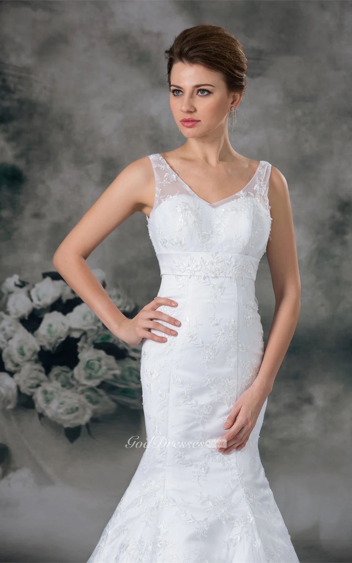 Dramatic Satin Appliqued Trumpet V Neck Wedding Dresses