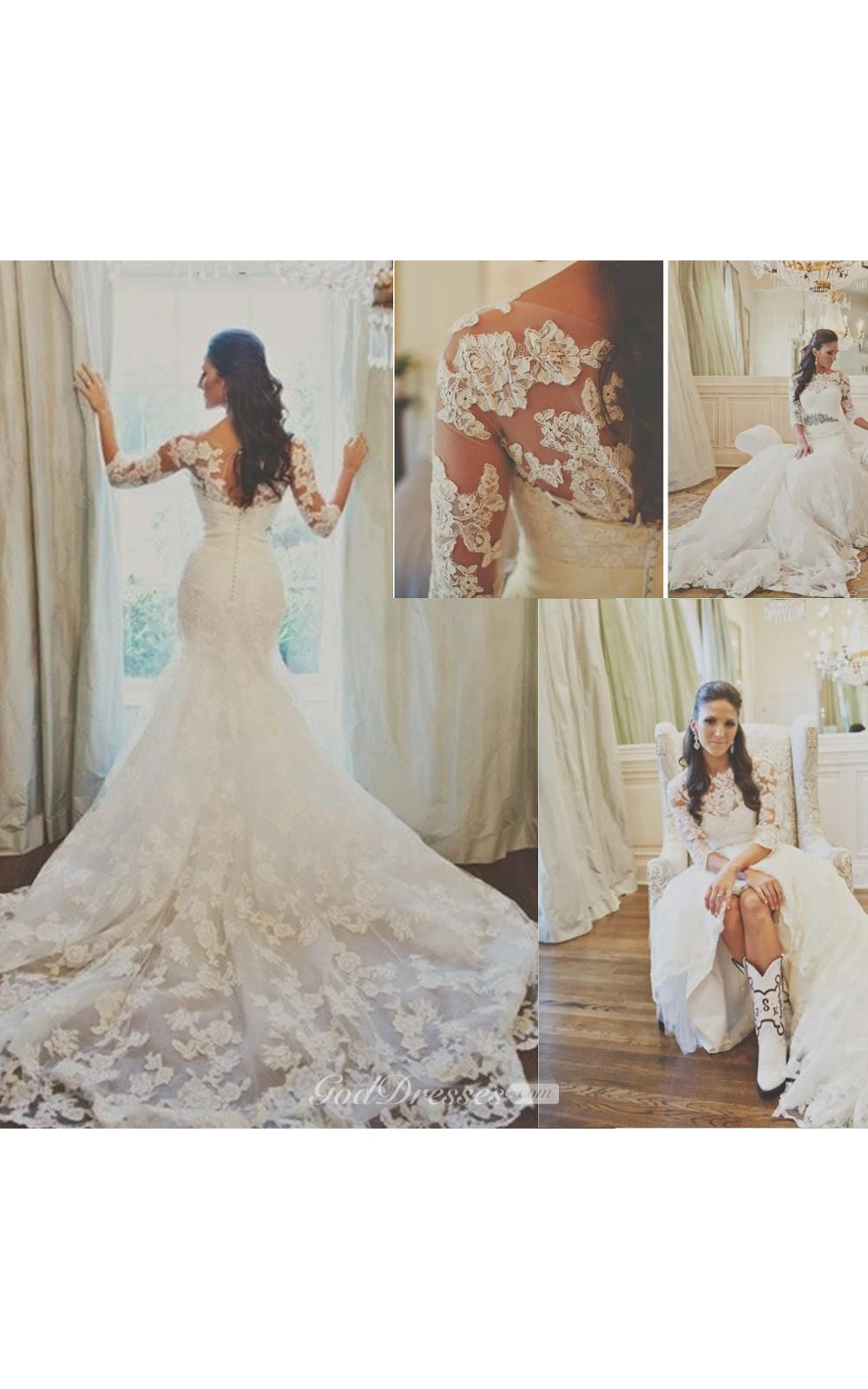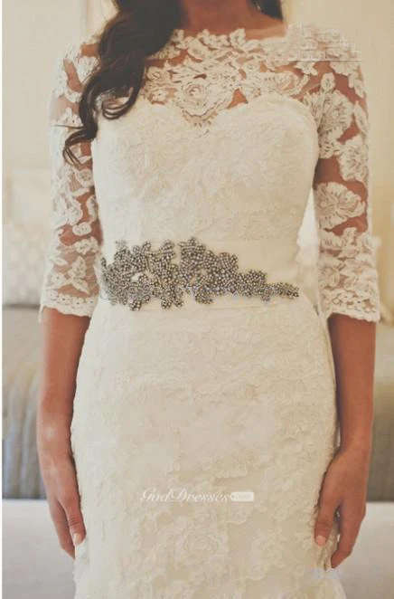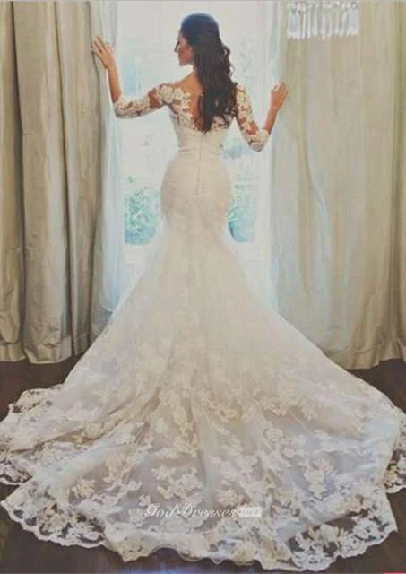 Elegant 3-4-long-sleeve Illusion Tulle Wedding Dress Lace Appliques