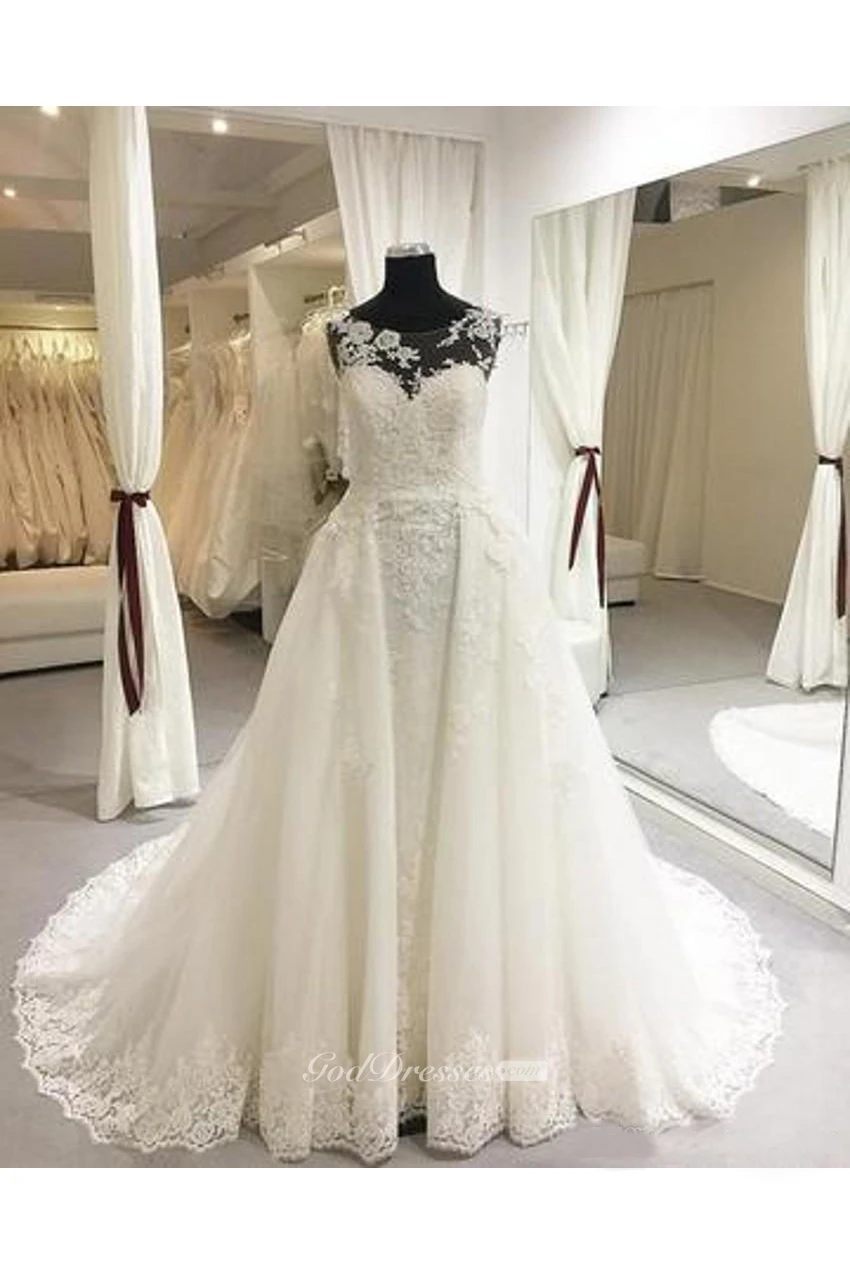 Elegant A-Line Floor-Length Scoop-Neck Sweep Train Wedding Dress With Illusion Back Style