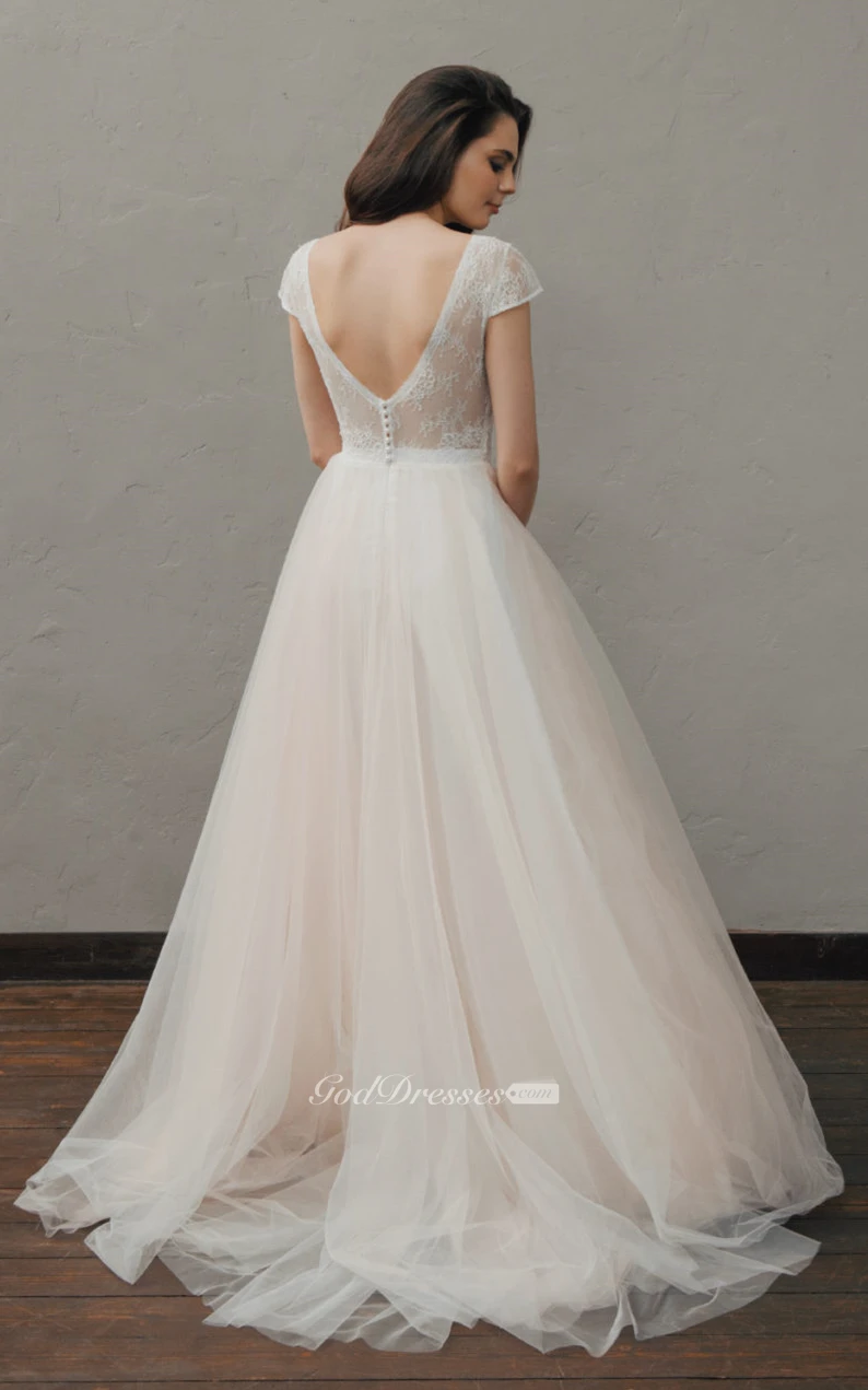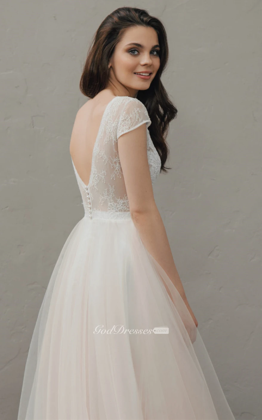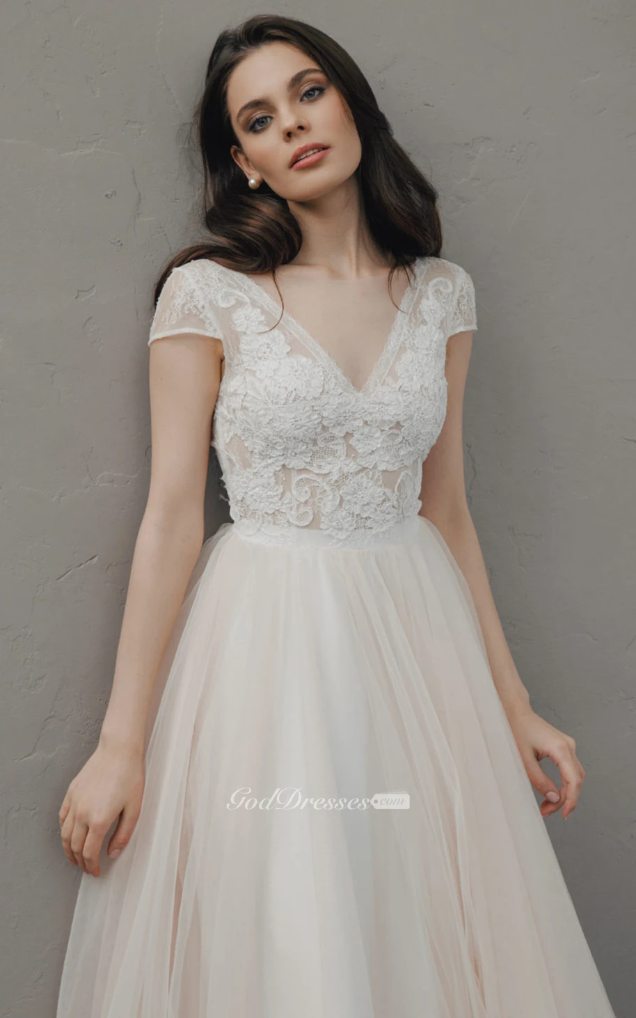 Elegant A Line Lace and Tulle V-neck Wedding Dress with Ruching