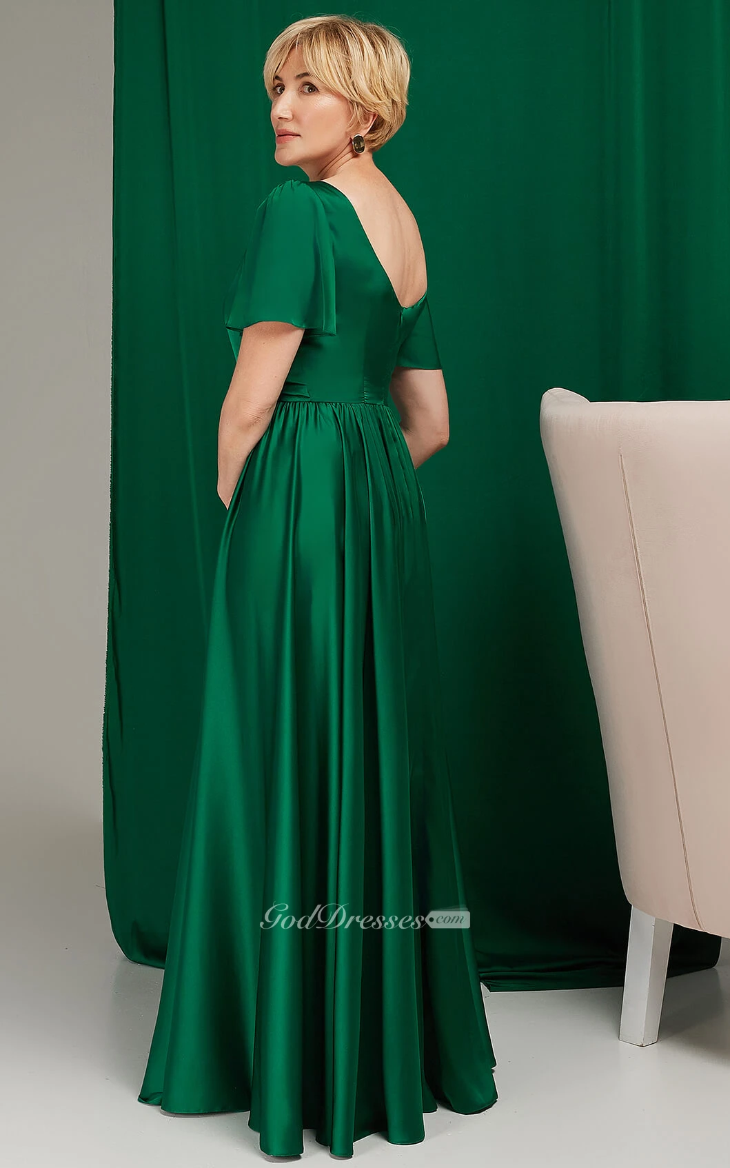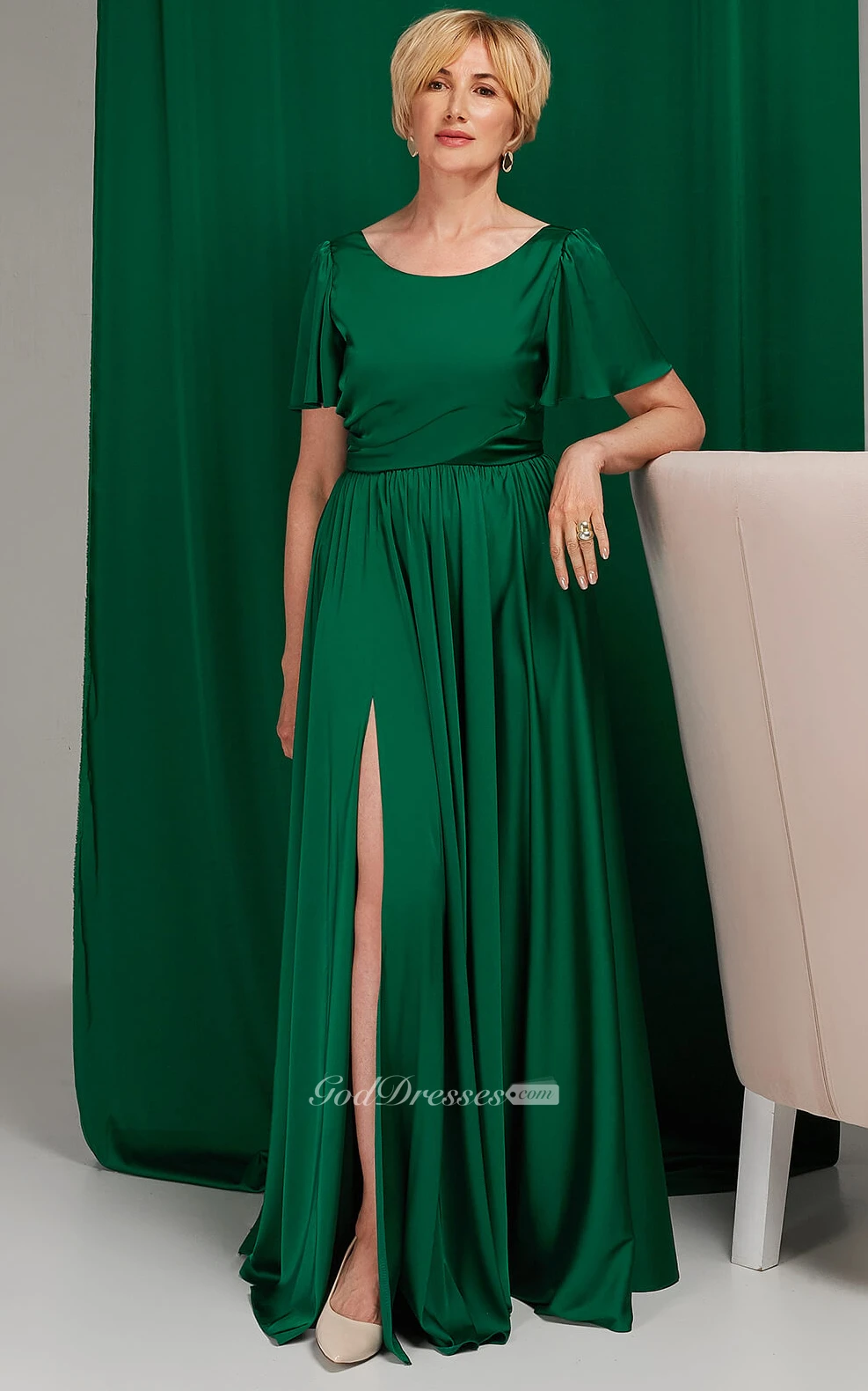 Elegant A Line Satin Bateau Floor-length Low-V Back Mother of the Bride Dress with Split Front