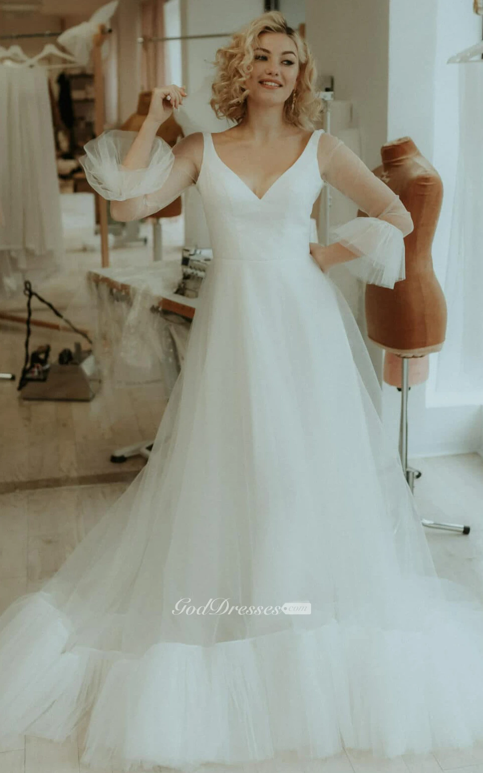 Elegant A Line Tulle V-neck Bell Wedding Dress with Ruching