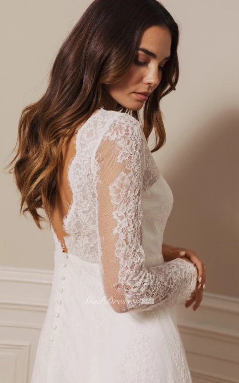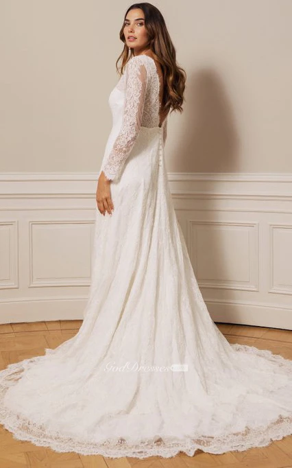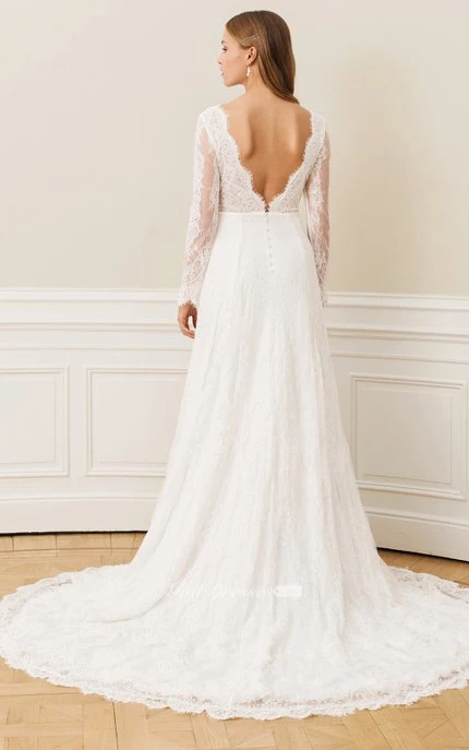 Elegant A Line V-neck Lace Floor-length Court Train Long Sleeve Deep-V Back Wedding Dress