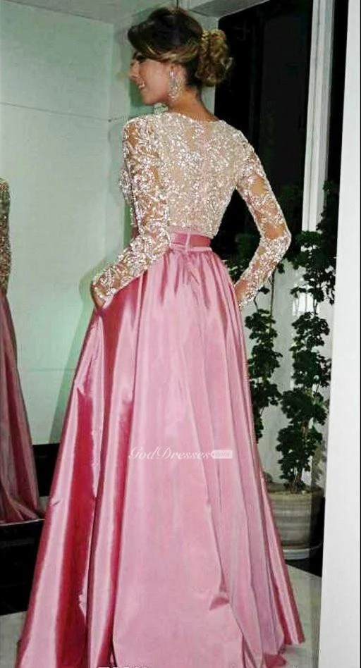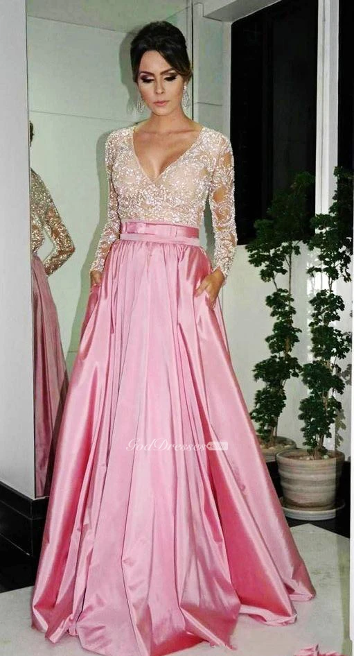 Elegant A-Line V-neck Prom Dresses Long Sleeve Evening Dresses With Beadings