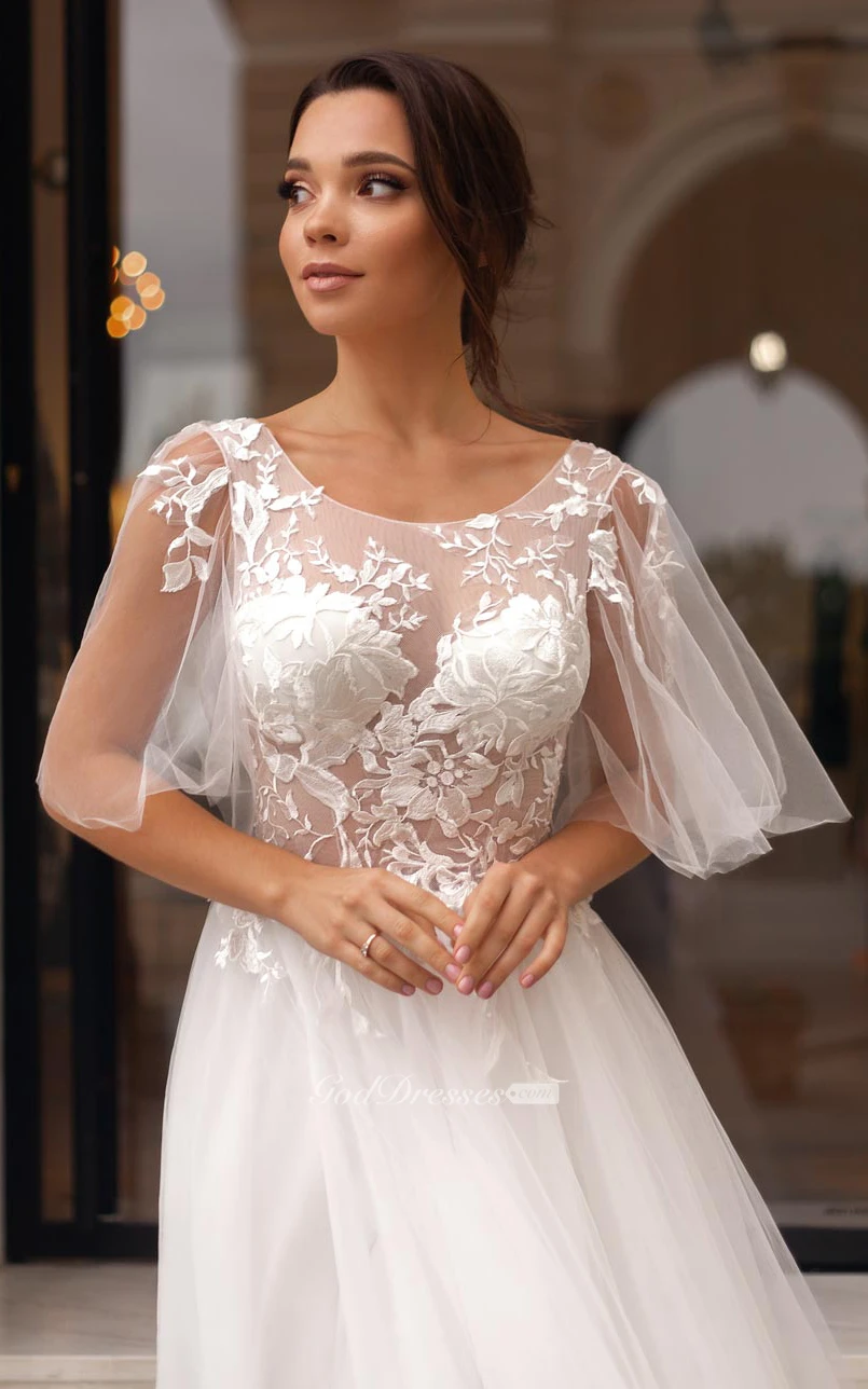 Elegant Bateau A Line Tulle and Lace Sweep Train Wedding Dress with Appliques