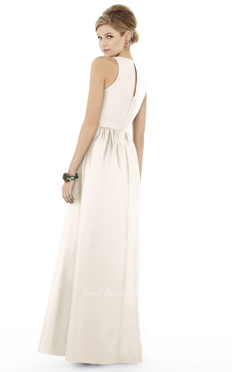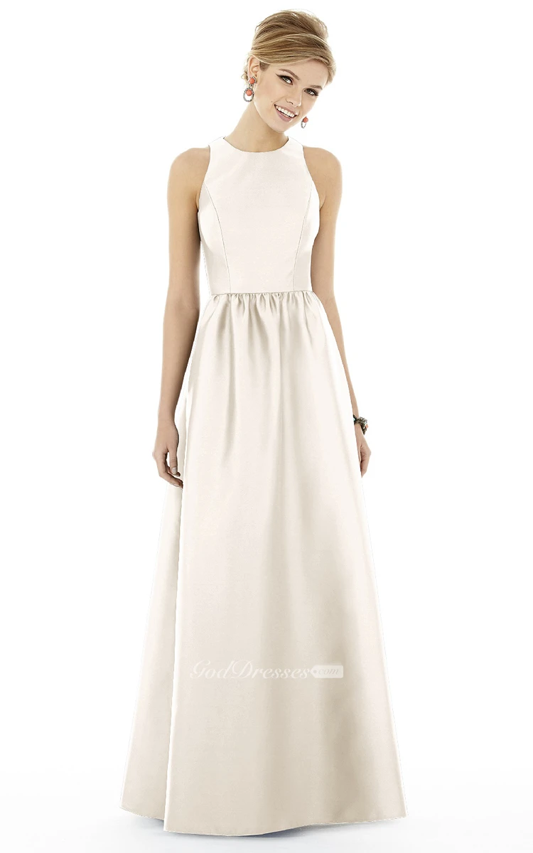 Elegant Floor-length Sleeveless Satin Dress with Jewel Neckline and Pleats