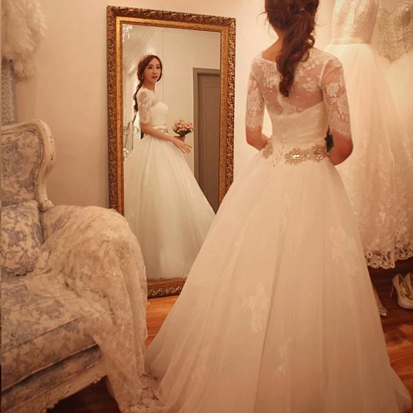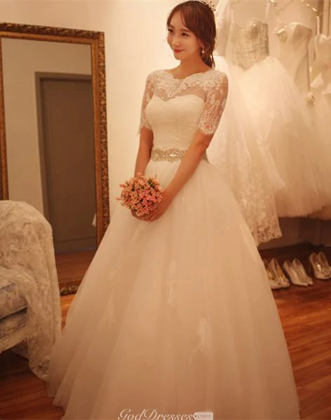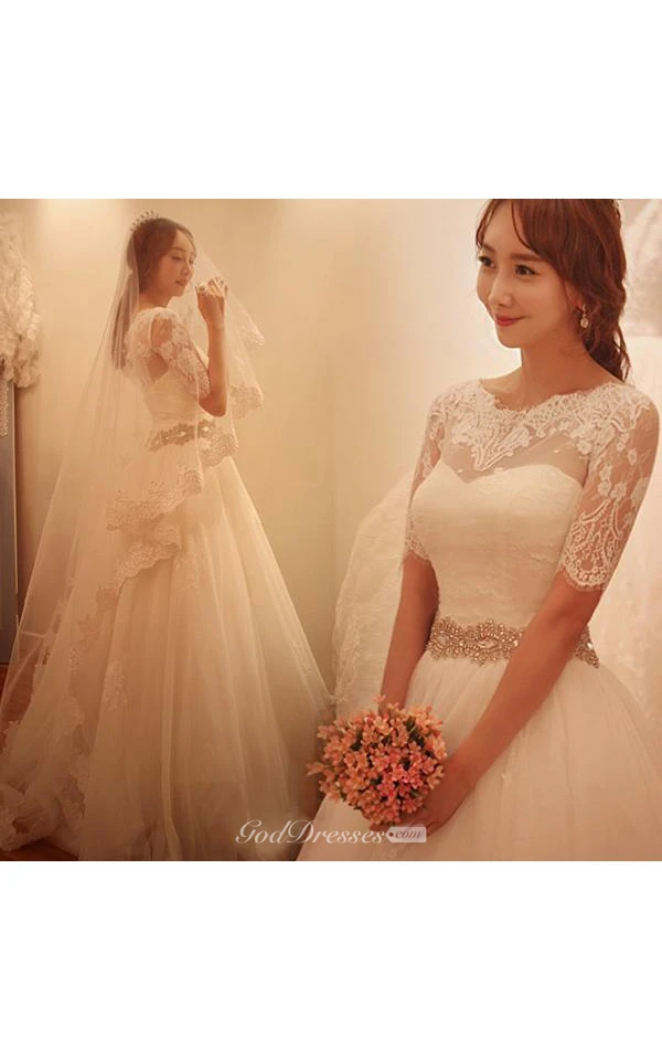 Elegant Half-Sleeve Tulle Lace Wedding Dresses A-Line With Crystal