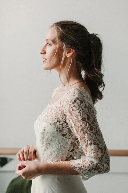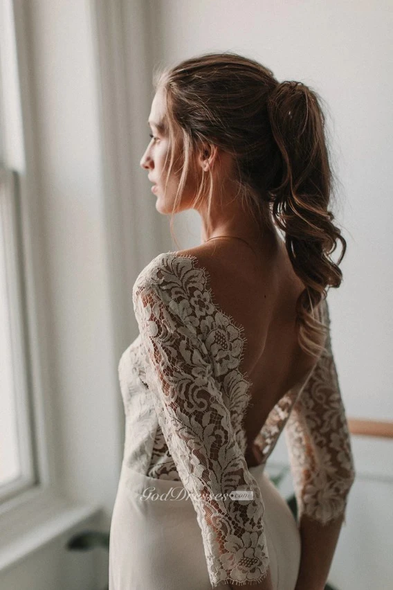 Elegant Lace and Chiffon Sheath 3/4 Sleeve Deep-V Back Bridal Gown
