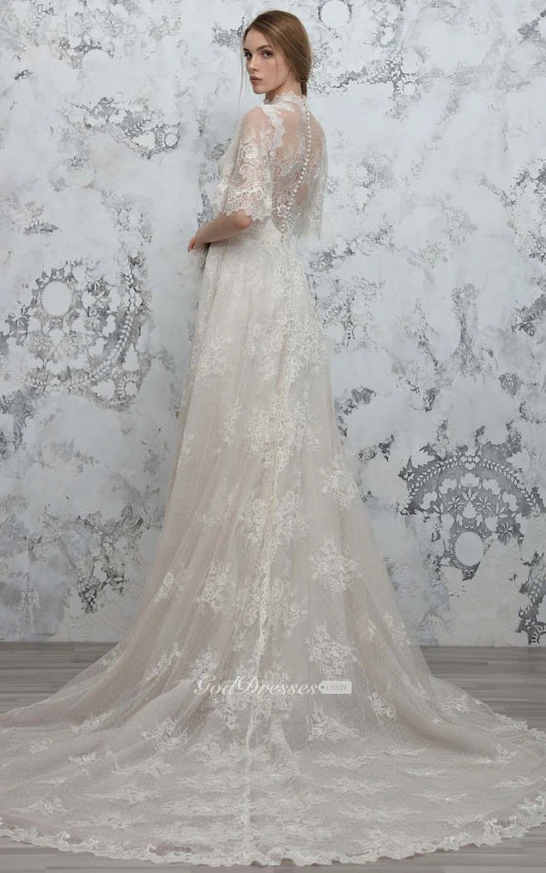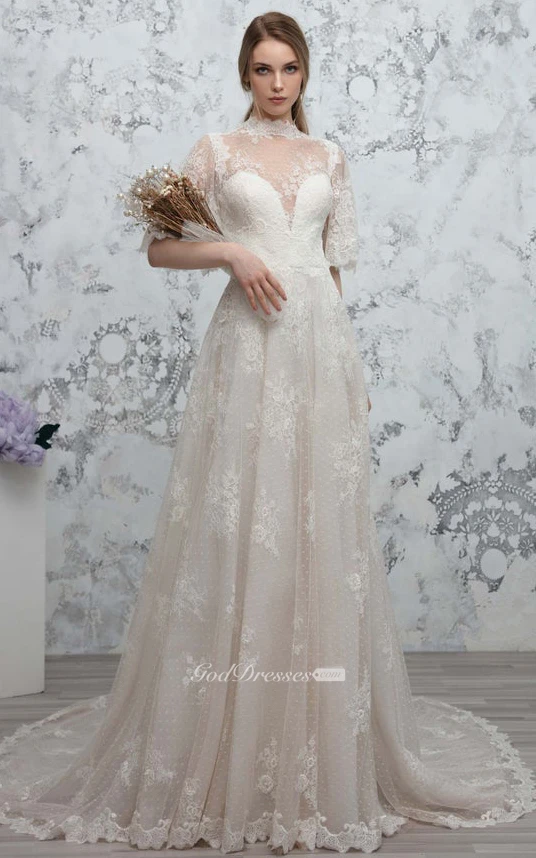 Elegant Lace High Neck Half Sleeve Ruching Wedding Dress With Button