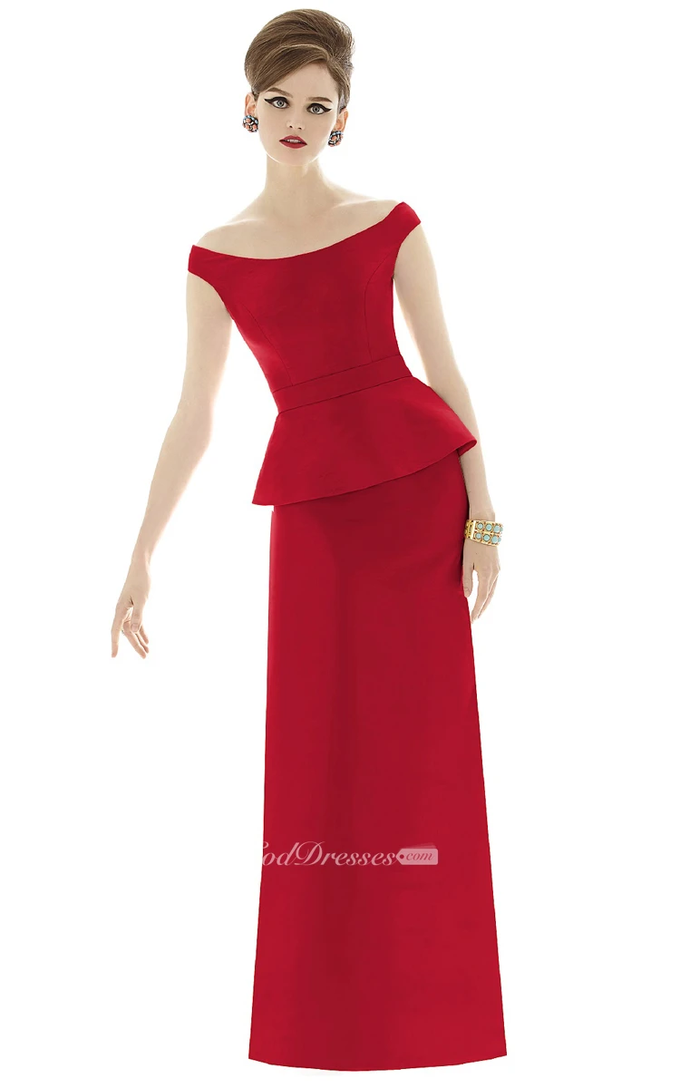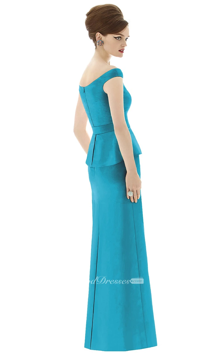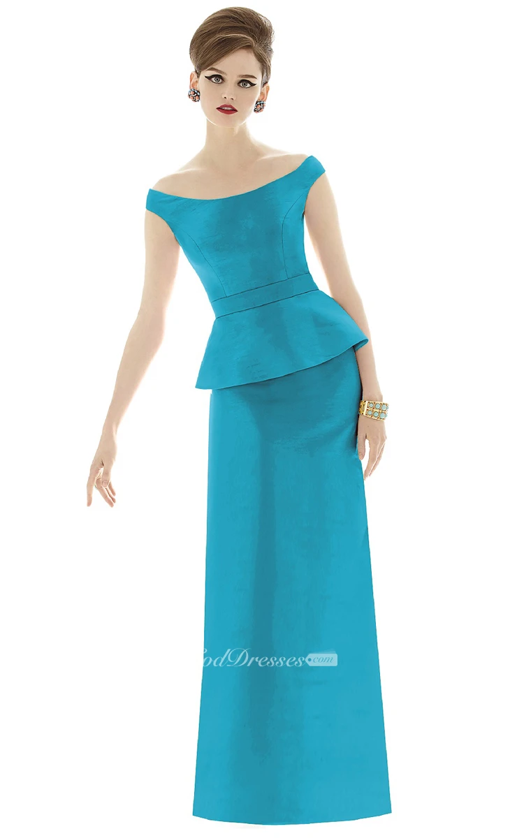 Elegant Long Off-the-Shoulder Satin Gown with Cap sleeves and Waistband
