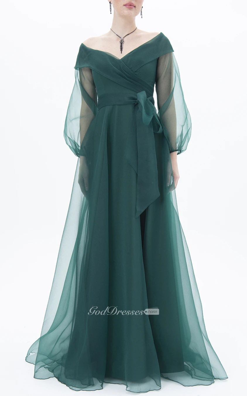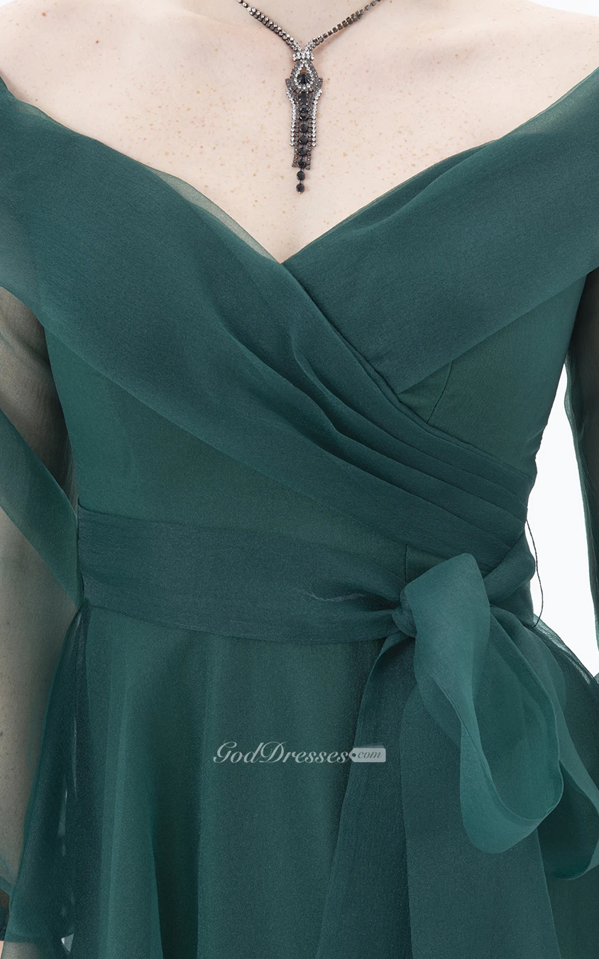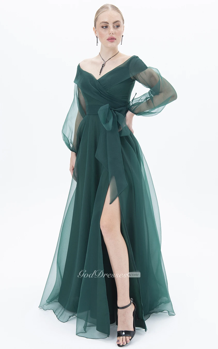 Elegant Long Sleeve Floor-length A Line Chiffon Zipper Formal Dress with Split Front