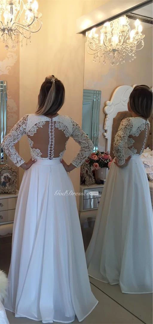 Elegant Long Sleeve Pearls Wedding Dresses A-Line Lace Floor Length