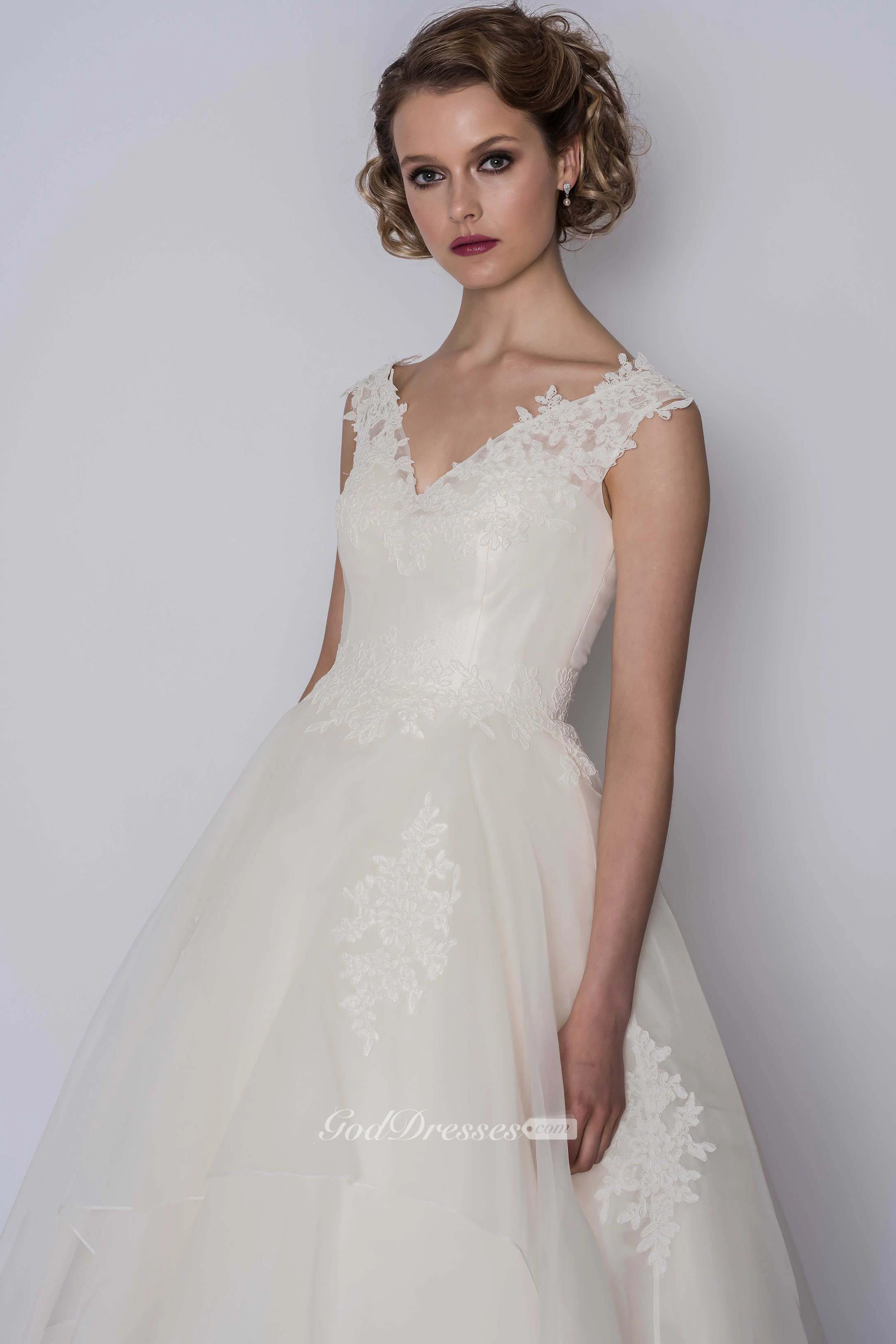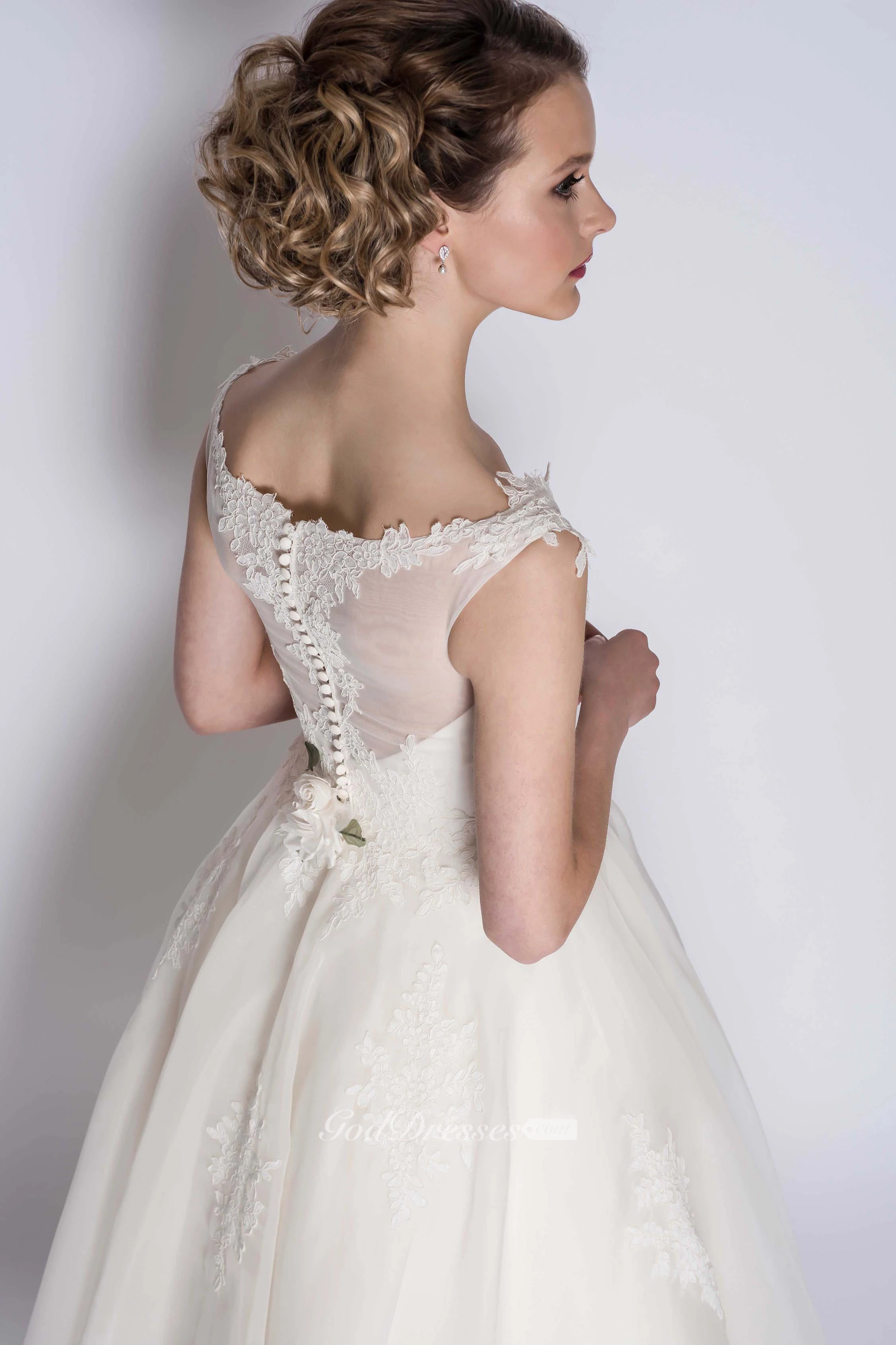 Elegant Organza Ball Gown Cap-Sleeve Ankle Length Bridal Gown with Flower